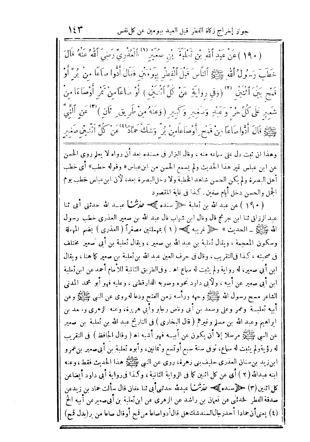(190) عن عبد الله بن ثعلبة بن صعيرٍ (1) العذري رضي الله عنه قال خطب رسول الله صلى الله عليه وسلم الناس قبل الفطر بيومين فقال أدوا صاعًا من برٍ أو قمح بين اثنين (2) (وفي روايةٍ عن كل اثنين) أو صاعًا من تمرٍ أو صاعًا من شعيرٍ على كل حرٍ وعبدٍ وصغيرٍ وكبيرٍ (وعنه من طريقٍ ثانٍ) (3) عن النبي صلى الله عليه وسلم قال أدوا صاعًا من قمحٍ أو صاعًا من برٍ وشك حماد (4) عن كل اثنين صغيرٍ