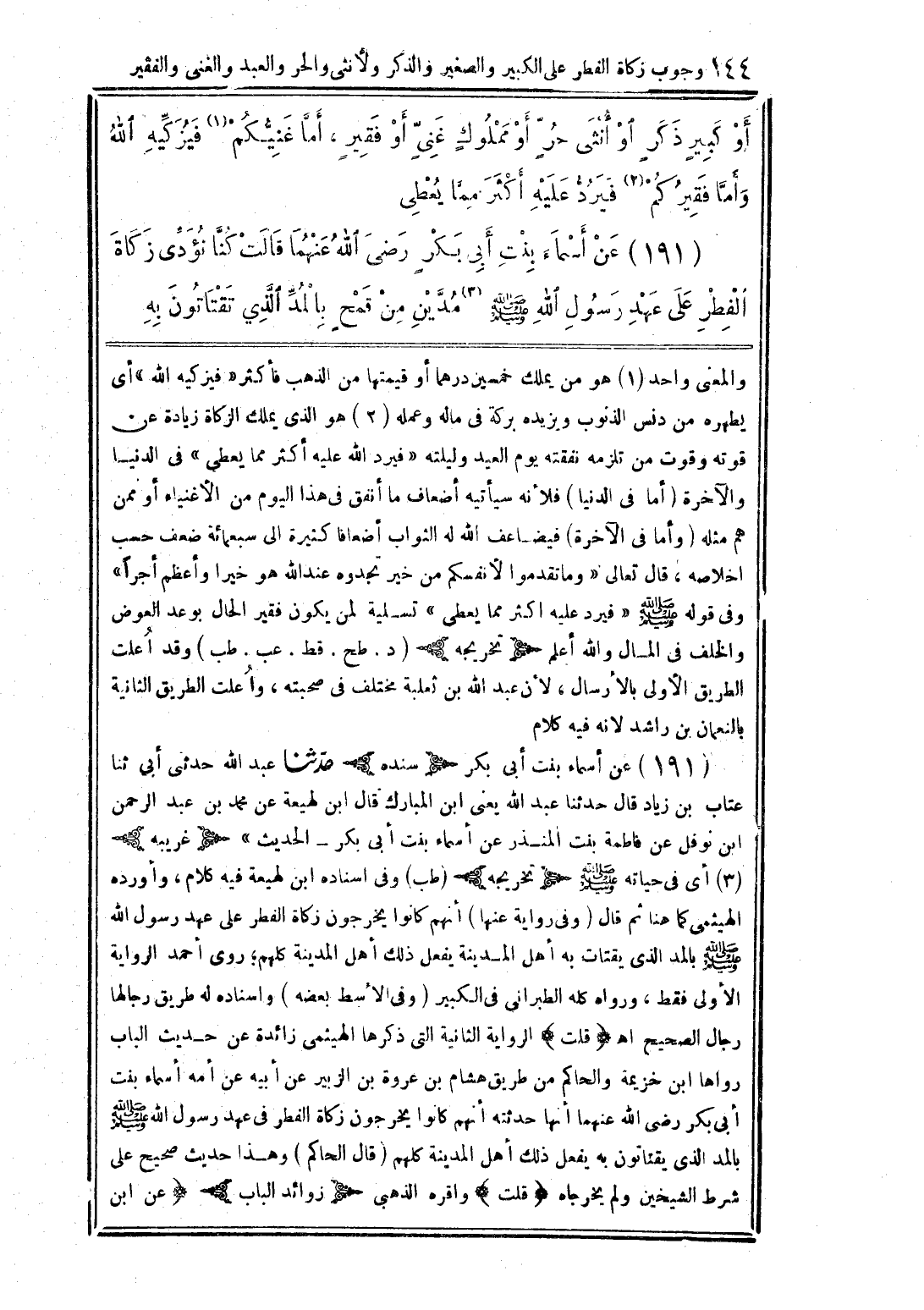 (191) عن أسماء بنت أبي بكرٍ رضي الله عنهما قالت كنا نؤدي زكاة الفطر على عهد رسول الله صلى الله عليه وسلم (3) مدين من قمحٍ بالمد الذي تقتاتون به