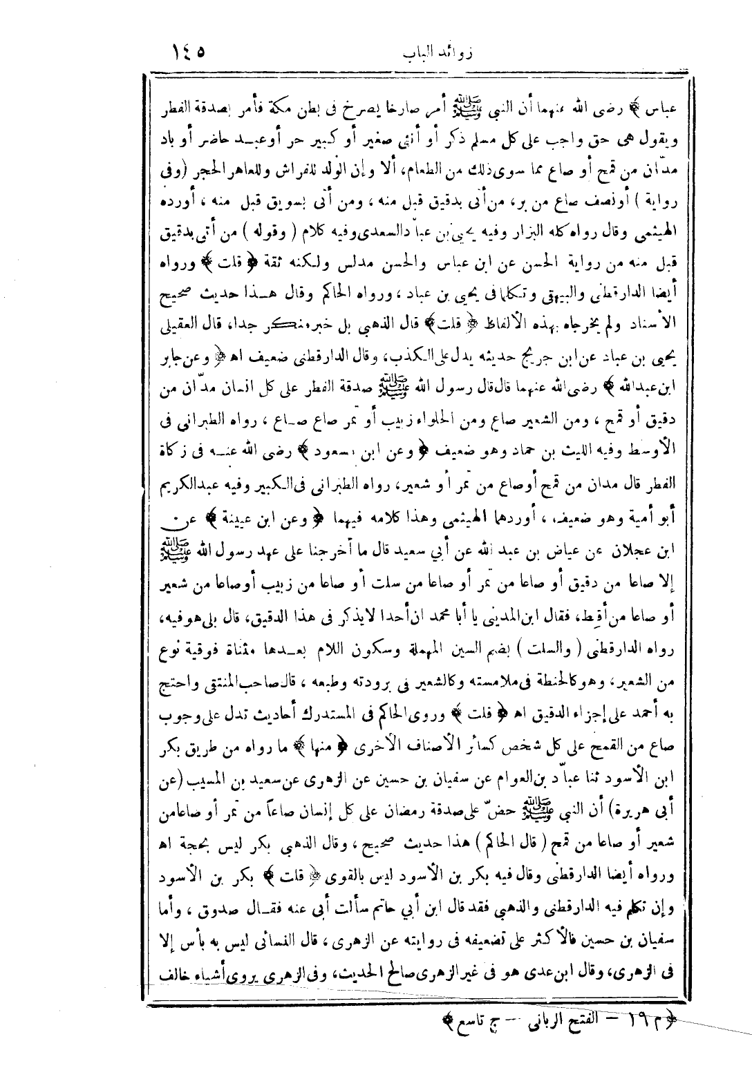 عباس) رضي الله عنهما أن النبي صلى الله عليه وسلم أمر صارخا يصرخ في بطن مكة فأمر بصدقة الفطر ويقول هي حق واجب على كل مسلم ذكر أو أنثى صغير أو كبير حر أو عبد حاضر أو باد مدان من قمح أو صاع مما سوى ذلك من الطعام، ألا وإن الولد للفراش وللعاهر الحجر (وفي رواية) أو نصف صاع من بر، من أتى بدقيق قبل منه، ومن أتى بسويق قبل منه، أورده الهيثمي وقال رواه كله البزار وفيه يحيي بن عباد السعدي وفيه كلام (وقوله) من أتى بدقيق قبل منه من رواية الحسن عن ابن عباس والحسن مدلس ولكنه ثقة (قلت) ورواه أيضا الدارقطني والبيهقي وتكلما في يحيي بن عباد، ورواه الحاكم وقال هذا حديث صحيح الأسناد ولم يخرجاه بهذه الألفاظ (قلت) قال الذهبي بل خبر منكر جدا، قال العقيلي يحيي بن عباد عن ابن جريج حديثه يدل على الكذب، وقال الدارقطني ضعيف أهـ (وعن جابر ابن عبد الله) رضي الله عنهما قال قال رسول الله صلى الله عليه وسلم صدقة الفطر على كل إنسان مدان من دقيق أو قمح، ومن الشعير صاع ومن الحلواء زبيب أو تمر صاع صاع، رواه الطبراني في الأوسط وفيه الليث بن حماد وهو ضعيف (وعن ابن مسعود) رضي الله عنه في زكاة الفطر قال مدان من قمح أو صاع من تمر أو شعير، رواه الطبراني في الكبير وفيه عبد الكريم أبو أمية وهو ضعيف، أوردهما الهيثمي وهذا كلامه فيهما (وعن ابن عيينة) عن ابن عجلان عن عياض بن عبد الله عن أبي سعيد قال ما أخرجنا على عهد رسول الله صلى الله عليه وسلم إلا صاعا من دقيق أو صاعا من تمر أو صاعا من سلت أو صاعا من زبيب أو صاعا من شعير أو صاعا من أقط، فقال ابن المديني يا أبا محمد أن أحدا لا يذكر في هذا الدقيق، قال بلى هو فيه، رواه الدارقطني (والسلت) بضم السين المهملة وسكون اللام بعدها مثناة فوقية نوع من الشعير، وهو كالحنطة في ملامسته وكالشعير في برودته وطبعه، قال صاحب المنتقى واحتج به أحمد على أجزاء الدقيق أهـ (قلت) وروى الحاكم في المستدرك أحاديث تدل على وجوب صاع من القمح على كل شخص كسائر الأصناف الأخرى (منها) ما رواه من طريق بكر ابن الأسود ثنا عباد بن العوام عن سفيان بن حسين عن الزهري عن سعيد بن المسيب (عن أبي هريرة) أن النبي صلى الله عليه وسلم حض على صدقة رمضان على كل إنسان صاعًا من تمر أو صاعا من شعير أو صاعا من قمح (قال الحاكم) هذا حديث صحيح، وقال الذهبي بكر ليس بحجة أهـ ورواه أيضا الدارقطني وقال فيه بكر بن الأسود ليس بالقوى (قلت) بكر بن الأسود وإن تكلم فيه الدارقطني والذهبي فقد قال ابن أبي حاتم سألت أبي عنه فقال صدوق، وأما سفيان بن حسين فالأكثر على تضعيفه في روايته عن الزهرى، قال النسائي ليس به بأس إلا في الزهري، وقال ابن عدى هو في غير الزهري صالح الحديث، وفي الزهري يروى أشياء خالف