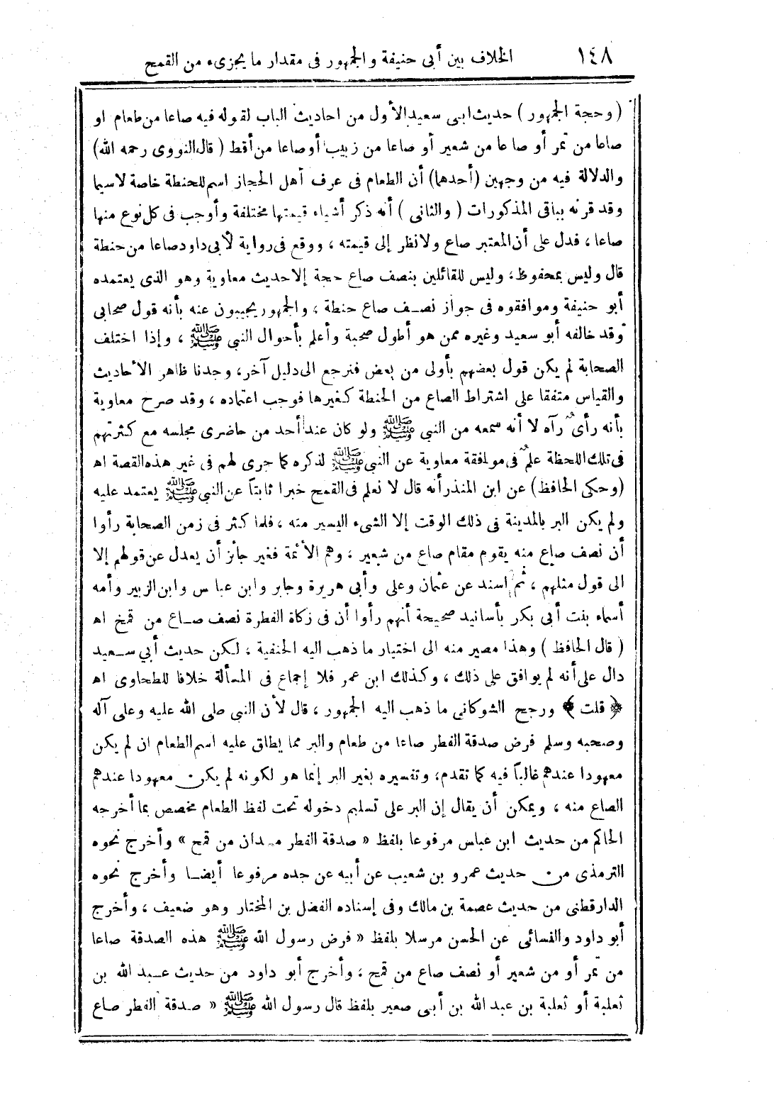 (وحجة الجمهور) حديث أبي سعيد الأول من أحاديث الباب لقوله فيه صاعا من طعام أو صاعا من تمر أو صاعا من شعير أو صاعا من زبيب أو صاعا من أقط (قال النووي رحمه الله) والدلالة فيه من وجهين (أحدهما) أن الطعام في عرف أهل الحجاز اسم للحنطة خاصة لاسيما وقد قرنه بباقي المذكورات (والثاني) أنه ذكر أشياء قيمتها مختلفة وأوجب في كل نوع منها صاعا، فدل على أن المعتبر صاع ولا نظر إلى قيمته، ووقع في رواية لأبي داود صاعا من حنطة قال وليس بمحفوظ، وليس للقائلين بنصف صاع حجة إلا حديث معاوية وهو الذي يعتمده أبو حنيفة وموافقوه في جواز نصف صاع حنطة، والجمهور يجيبون عنه بأنه قول صحابي وقد خالفه أبو سعيد وغيره ممن هو أطول صحبة وأعلم بأحوال النبي صلى الله عليه وسلم، وإذا اختلف الصحابة لم يكن قول بعضهم بأولى من بعض فنرجع إلى دليل آخر، وجدنا ظاهر الأحاديث والقياس متفقا على اشتراط الصاع من الحنطة كغيرها فوجب اعتماده، وقد صرح معاوية بأنه رأى رآه لا أنه سمعه من النبي صلى الله عليه وسلم ولو كان عند أحد من حاضرى مجلسه مع كثرتهم في تلك اللحظة علم في موافقة معاوية عن النبي صلى الله عليه وسلم لذكره كما جرى لهم في غير هذه القصة أهـ (وحكى الحافظ) عن ابن المنذر أنه قال لا نعلم في القمح خبراً ثابتًا عن النبي صلى الله عليه وسلم يعتمد عليه ولم يكن البر بالمدينة في ذلك الوقت إلا الشيء اليسير منه، فلما كثر في زمن الصحابة رأوا أن نصف صاع منه يقوم مقام صاع من شعير، وهم الأئمة فغير جائز أن يعدل عن قولهم إلا إلى قول مثلهم، ثم أسند عن عثمان وعلي وأبي هريرة وجابر وابن عباس وابن الزبير وأمه أسماء بنت أبي بكر بأسانيد صحيحة أنهم رأوا أن في زكاة الفطرة نصف صاع من قمح أهـ (قال الحافظ) وهذا مصير منه إلى اختيار ما ذهب إليه الحنفية، لكن حديث أبي سعيد دال على أنه لم يوافق على ذلك، وكذلك ابن عمر فلا إجماع في المسألة خلافا للطحاوي أهـ (قلت) ورجح الشوكاني ما ذهب إليه الجمهور، قال لأن النبي صلى الله عليه وسلم وعلى آله وصحبه وسلم فرض صدقة الفطر صاعا من طعام والبر مما يطلق عليه اسم الطعام إن لم يكن معهودا عندهم غالبًا فيه كما تقدم، وتفسيره بغير البر إنما هو لكونه لم يكن معهودا عندهم الصاع منه، ويمكن أن يقال إن البر على تسليم دخوله تحت لفظ الطعام مخصص بما أخرجه الحاكم من حديث ابن عباس مرفوعا بلفظ "صدقة الفطر ميدان من قمح" وأخرج نحوه الترمذي من حديث عمرو بن شعيب عن أبيه عن جده مرفوعا أيضا وأخرج نحوه الدارقطني من حديث عصمة بن مالك وفي إسناده الفضل بن المختار وهو ضعيف، وأخرج أبو داود والنسائي عن الحسن مرسلا بلفظ "فرض رسول الله صلى الله عليه وسلم هذه الصدقة صاعا من تمر أو من شعير أو نصف صاع من قمح، وأخرج أبو داود من حديث عبد الله بن ثعلبة أو ثعلبة بن عبد الله بن أبي صغير بلفظ قال رسول الله صلى الله عليه وسلم "صدقة الفطر صاع
