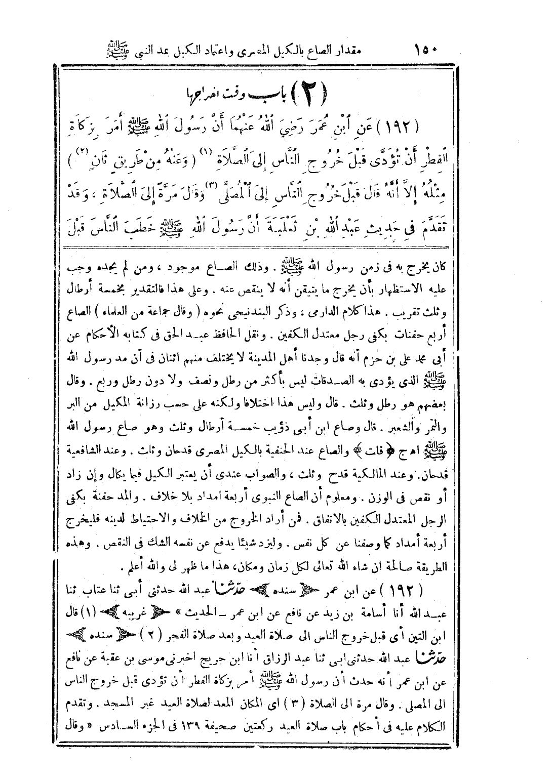 (192) عن ابن عمر رضي الله عنهما أن رسول الله صلى الله عليه وسلم أمر بزكاة الفطر أن تؤدي قبل خروج الناس إلى الصلاة (1) (وعنه من طريقٍ ثانٍ (2)) مثله إلا أنه قال قبل خروج الناس إلى المصلى (3) وقال مرًة إلى الصلاة، وقد تقدم في حديث عبد الله بن ثعلبة أن رسول الله صلى الله عليه وسلم خطب الناس قبل