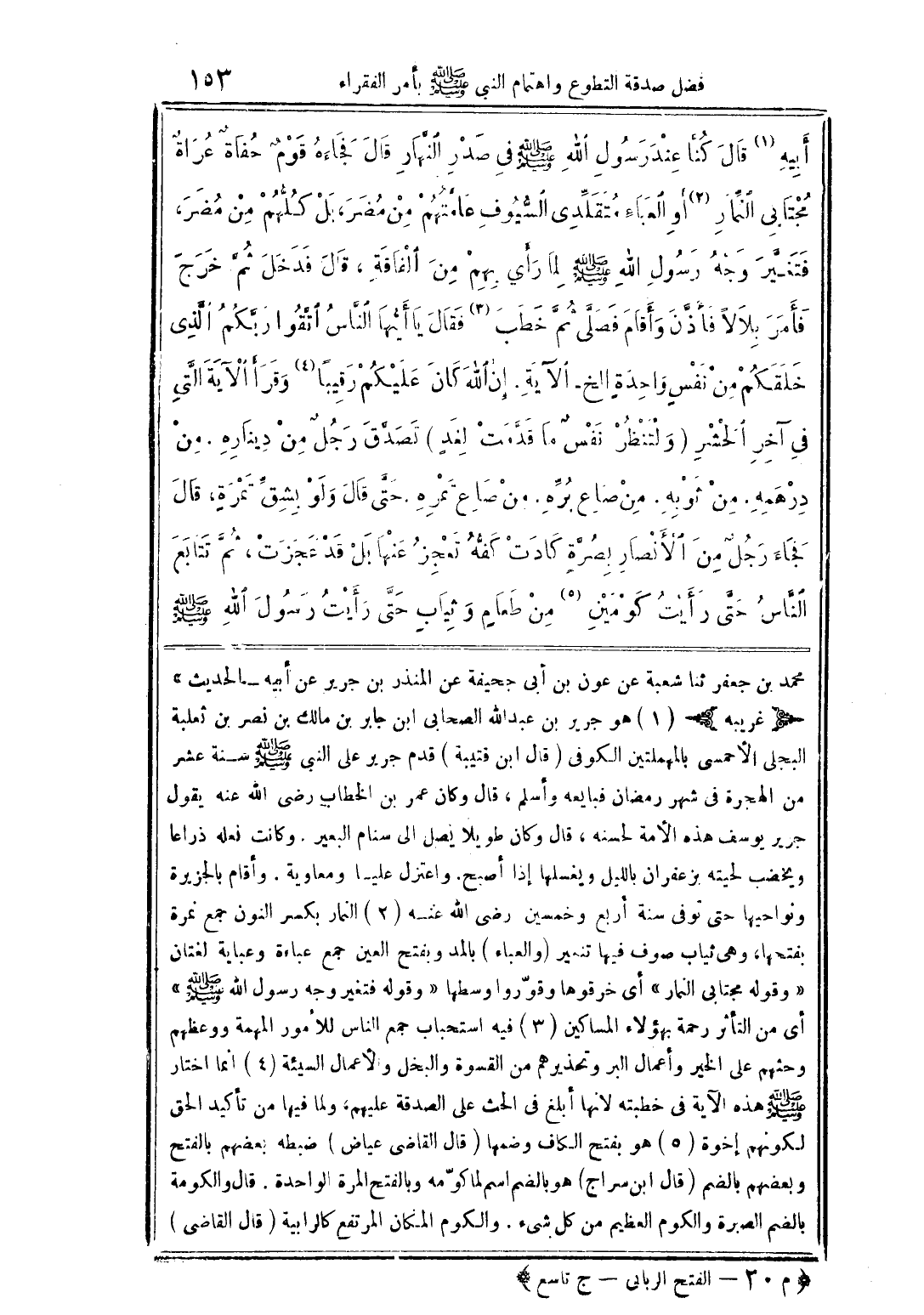 محمد بن جعفر ثنا شعبة عن عون بن أبى جحيفة عن المنذر بن جرير عن أبيه- الحديث" (غريبه) (1) هو جرير بن عبد الله الصحابى ابن جابر بن مالك بن نصر بن ثعلبة البجلى الأحمسى بالمهملتين الكوفى (قال ابن قتيبة) قدم جرير على النبى صلى الله عليه وسلم سنة عشر من الهجرة فى شهر رمضان فبايعه وأسلم، قال وكان عمر بن الخطاب رضى الله عنه يقول جرير يوسف هذه الأمة لحسنه، قال وكان طويلا يصل الى سنام البعير. وكانت نعله ذراعا ويخضب لحيته بزعفران بالليل ويغسلها إذا أصبح. واعتزل عليا ومعاوية. وأقام بالجزيرة ونواحيها حتى توفى سنة أربع وخمسين رضى الله عنه (2) النمار بكسر النون جمع نمرة بفتحها، وهى ثياب صوف فيها تنمير (والعباء) بالمد وبفتح العين جمع عباءة وعباية لغتان "وقوله مجتابى النمار" أى خرقوها وقوّروا وسطها "وقوله فتغير وجه رسول الله صلى الله عليه وسلم" أى من التأثر رحمة بهؤلاء المساكين (3) فيه استحباب جمع الناس للأمور المهمة ووعظهم وحثهم على الخير وأعمال البر وتحذيرهم من القسوة والبخل والأعمال السيئة (4) انما اختار صلى الله عليه وسلم هذه الآية فى خطبته لانها أبلغ فى الحث على الصدقة عليهم، ولما فيها من تأكيد الحق لكونهم إخوة (5) هو بفتح الكاف وضمها (قال القاضى عياض) ضبطه بعضهم بالفتح وبعضهم بالضم (قال ابن سراج) هو بالضم اسم لما كوّمه وبالفتح المرة الواحدة. قال والكومة بالضم الصبرة والكوم العظيم من كل شاء. والكوم المكان المرتفع كالرابية (قال القاضي)
