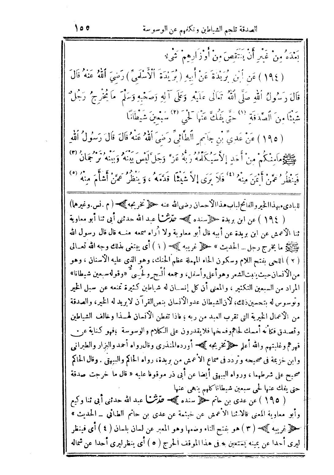 (194) عن ابن بريدة عن أبيه (بريدة الأسلمىِّ) رضي الله عنه قال قال رسول الله صلَّى الله تعالى عليه وعلى آله وصحبه وسلَّم ما يخرج رجلٌ شيئًا من الصَّدقة (1) حتَّى يفكَّ عنها لحي (2) سبعين شيطانًا