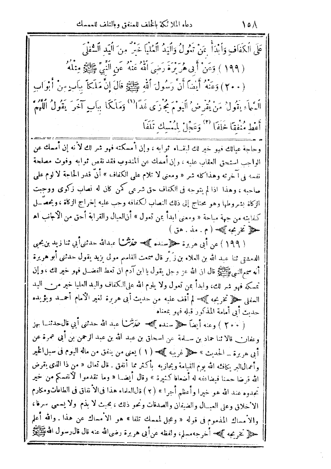 (200) وعنه أيضًا أنَّ رسول الله صلى الله عليه وسلم قال إنَّ ملكًا ببابٍ من أبواب السَّماء يقول من يقرض اليوم يجزى غدًا (1) وملكا ببابٍ آخر يقول اللَّهمَّ أعط منفقًا خلفًا (2) وعجِّل لممسكٍ تلفًا
