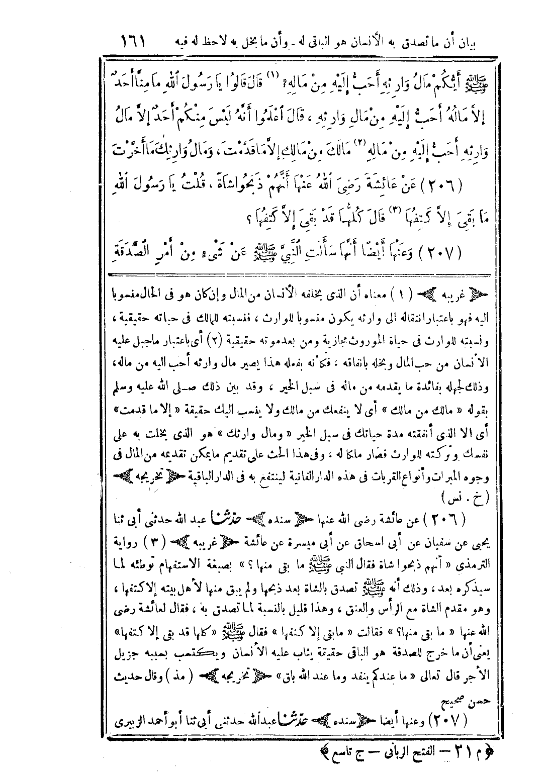 (206) عن عائشة رضى الله عنها أنَّهم ذبحوا شاةً، قلت يا رسول الله ما بقى إلَّا كتفها (3) قال كلُّها قد بقى إلَّا كتفها؟