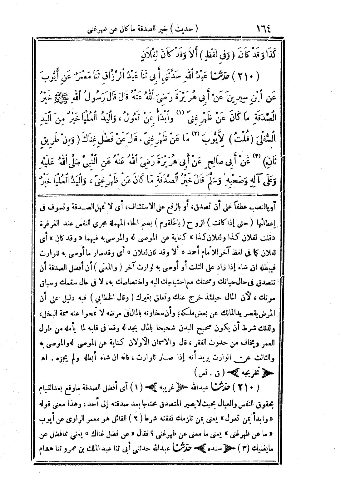 (210) حدّثنا عبد الله حدَّثنى أبى ثنا عبد الرَّزَّاق ثنا معمرٌ عن أيُّوب عن ابن سيرين عن أبى هريرة رضى الله عنه قال قال رسول الله صلى الله عليه وسلم خير الصَّدقة ما كان عن ظهر غنًى (1) وابدأ بمن تعول، واليد العليا خيرٌ من اليد السُّفلى (قلت) لأيُّوب (2) ما عن ظهر غنًى، قال عن فضل غناك (ومن طريقٍ ثانٍ) (3) عن أبى صالحٍ عن أبى هريرة رضى الله عنه عن النَّبىِّ صلَّى الله عليه وعلى آله وصحبه وسلَّم قال خير الصَّدقة ما كان عن ظهر غنًى، واليد العليا خيرٌ