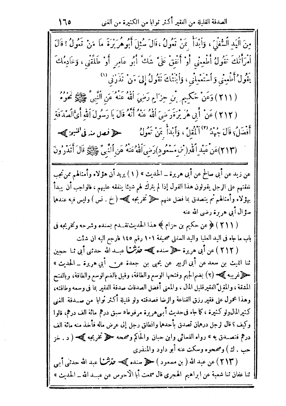 (212) عن أبى هريرة رضى الله عنه أنَّه قال يا رسول الله أىُّ الصَّدقة أفضل؟ قال جهد (2) المقلِّ، وابدأ بمن تعول (فصل منه فى المنيحة)
