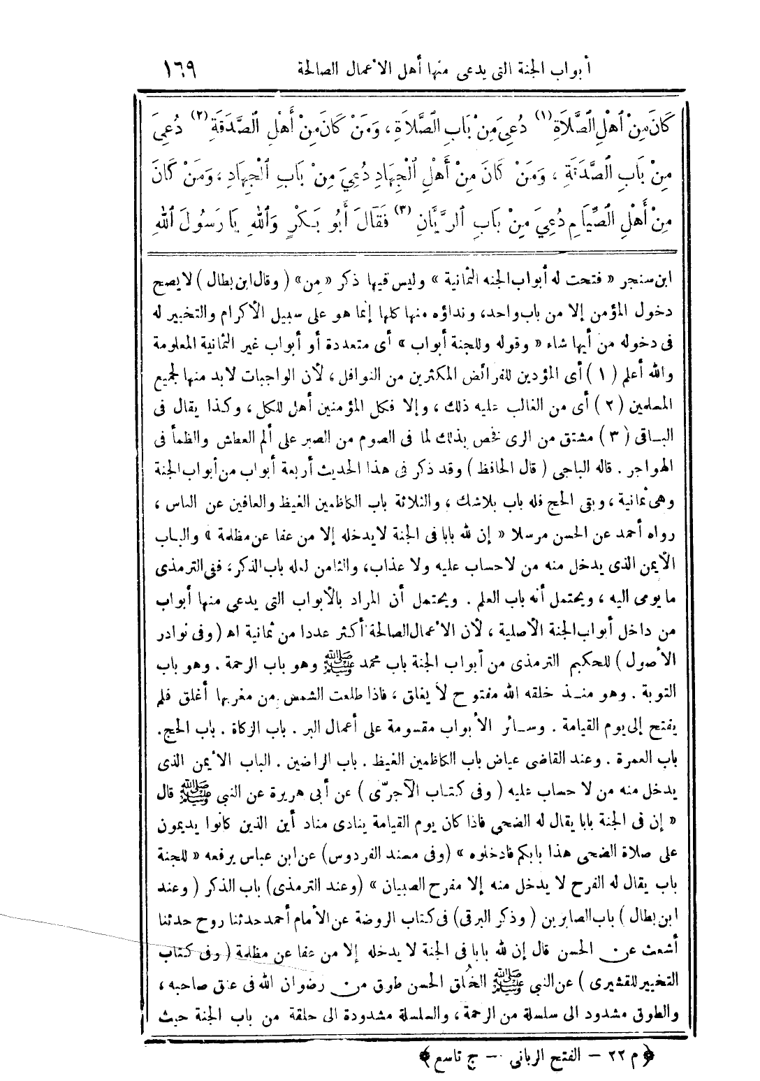 كان من أهل الصَّلاة (1) دعى من باب الصَّلاة، ومن كان من أهل الصَّدقة (2) دعى من باب الصَّدقة، ومن كان من أهل الجهاد دعي من باب الجهاد، ومن كان من أهل الصِّيام دعي من باب الرَّيَّان (3) فقال أبو بكرٍ والله يا رسول الله