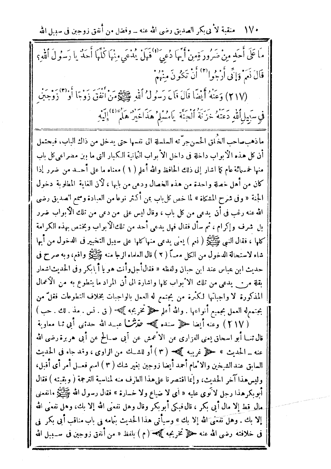 (217) وعنه أيضًا قال قال رسول الله صلى الله عليه وسلم من أنفق زوجًا أو (3) زوجين في سبيل الله دعته خزنة الجنَّة يا مسلم هذا خيرٌ هلمَّ (4) إليه