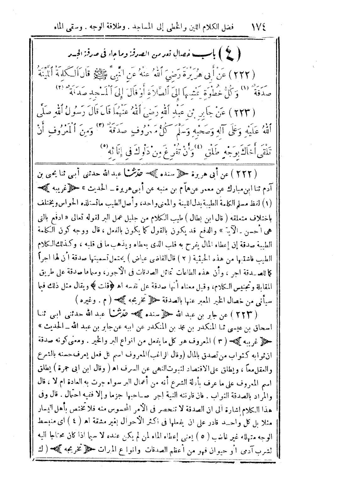 (222) عن أبى هريرة رضي الله عنه عن النَّبىِّ صلى الله عليه وسلم قال الكلمة اللَّيِّنة صدقةٌ (1) وكلُّ خطوةٍ يمشها إلى الصَّلاة أو قال إلى المسجد صدقةٌ (3)