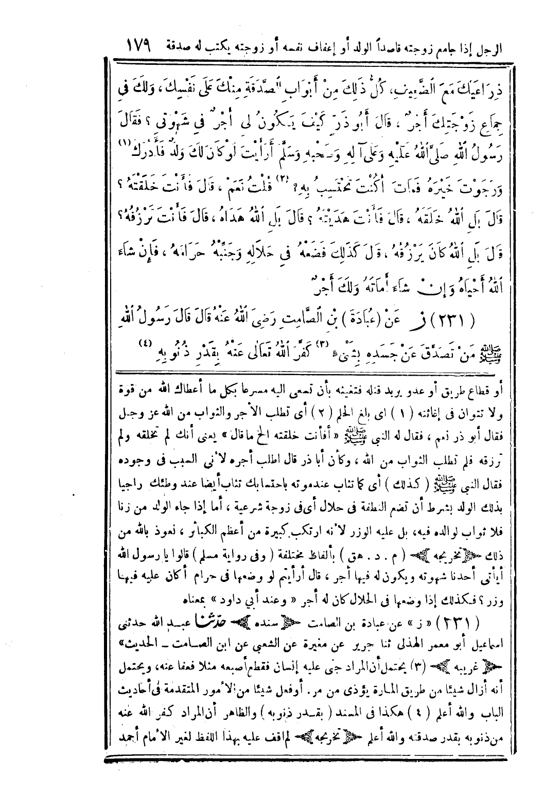 (231) ز عن (عبادة) بن الصَّامت رضى الله عنه قال قال رسول الله صلى الله عليه وسلم من تصدَّق عن جسده بشاءٍ (3) كفَّر الله تعالى عنه بقدر ذنوبه (4)