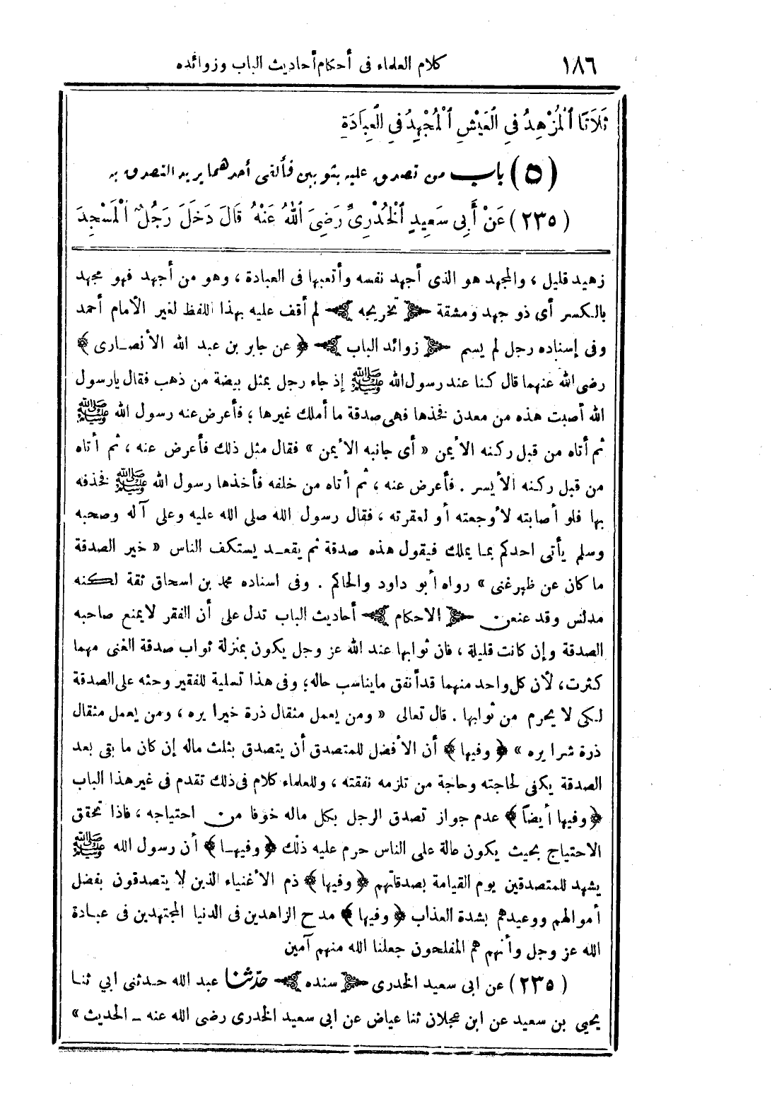 زهيد قليل، والمجهد هو الذى أجهد نفسه وأتعبها فى العبادة، وهو من أجهد فهو مجهد بالكسر أى ذو جهد ومشقة (تخريجه) لم أقف عليه بهذا اللفظ لغير الأمام أحمد وفى إسناده رجل لم يسم (زوائد الباب) (عن جابر بن عبد الله الأنصارى) رضى الله عنهما قال كنا عند رسول الله صلى الله عليه وسلم إذ جاء رجل بمثل بيضة من ذهب فقال يا رسول الله أصبت هذه من معدن فخذها فهى صدقة ما أملك غيرها؛ فأعرض عنه رسول الله صلى الله عليه وسلم ثم أتاه من قبل ركنه الأيمن "أى جانبه الأيمن" فقال مثل ذلك فأعرض عنه، ثم أتاه من قبل ركنه الأيسر. فأعرض عنه، ثم أتاه من خلفه فأخذها رسول الله صلى الله عليه وسلم فحذفه بها فلو أصابته لأوجعته أو لعقرته، فقال رسول الله صلى الله عليه وعلى آله وصحبه وسلم يأتى احدكم بما يملك فيقول هذه صدقة ثم يقعد يستكف الناس "خير الصدقة ما كان عن ظهر غنى" رواه أبو داود والحاكم. وفى اسناده محمد بن اسحاق ثقة لكنه مدلس وقد عنعن (الاحكام) أحاديث الباب تدل على أن الفقر لا يمنع صاحبه الصدقة وإن كانت قليلة، فان ثوابها عند الله عز وجل يكون بمنزلة ثواب صدقة الغنى مهما كثرت، لأن كل واحد منهما قد أنفق ما يناسب حاله؛ وفى هذا تسلية للفقير وحثه على الصدقة لكى لا يحرم من ثوابها. قال تعالى {ومن يعمل مثقال ذرة خيرا يره، ومن يعمل مثقال ذرة شرا يره} (وفيها) أن الأفضل للمتصدق أن يتصدق بثلث ماله إن كان ما بقى بعد الصدقة يكفى لحاجته وحاجة من تلزمه نفقته، وللعلماء كلام فى ذلك تقدم فى غير هذا الباب (وفيها أيضًا) عدم جواز تصدق الرجل بكل ماله خوفا من احتياجه، فاذا تحقق الاحتياج بحيث يكون عالة على الناس حرم عليه ذلك (وفيها) أن رسول الله صلى الله عليه وسلم يشهد للمتصدقين يوم القيامة بصدقاتهم (وفيها) ذم الأغنياء الذين لا يتصدقون بفضل أموالهم ووعيدهم بشدة العذاب (وفيها) مدح الزاهدين فى الدنيا المجتهدين فى عبادة الله عز وجل وأنهم هم المفلحون جعلنا الله منهم آمين