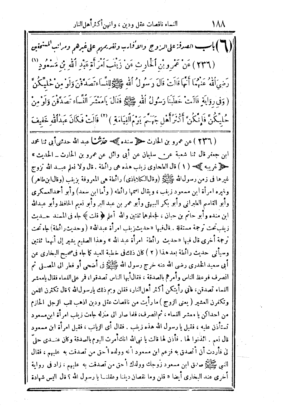 (236) عن عمرو بن الحارث عن زينب امرأة عبد الله بن مسعود (1) رضي الله عنهما أنَّها قالت قال رسول الله صلى الله عليه وسلم للنِّساء تصدَّقن ولو من حليِّكنَّ (وفى روايةٍ قالت خطبنا رسول الله صلى الله عليه وسلم فقال يا معشر النِّساء تصدَّقن ولو من حليِّكنَّ فإنَّكنَّ أكثر أهل جهنَّم يوم القيامة) (2) قالت فكان عبد الله خفيف