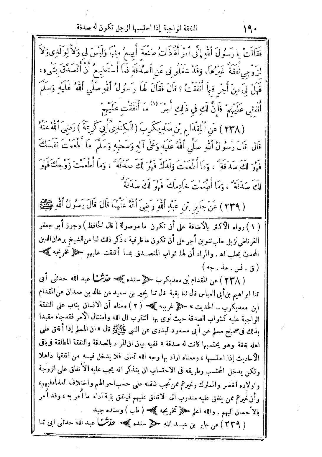 (238) عن المقدام بن معد يكرب (سنده) حدّثنا عبد الله حدثنى أبى ثنا ابراهيم بن أبى العباس قال ثنا بقية قال ثنا بحير بن سعيد عن خالد بن معدان عن المقدام ابن معد يكرب- الحديث" (غريبه) (2) معناه أن الانسان يثاب على النفقة الواجبة عليه كثواب الصدقة حيث نوى بها التقرب الى الله وامتثال الأمر فقد جاء مقيدا بذلك فى صحيح مسلم عن أبى مسعود البدرى عن النبى صلى الله عليه وسلم قال "ان المسلم إذا أنفق على اهله نفقة وهو يحتسبها كانت له صدقة" ففيه بيان ان المراد بالصدقة والنفقة المطلقة فى باقى الأحاديث إذا احتسبها، ومعناه اراد بها وجه الله تعالى فلا يدخل فيه من انفقها ذاهلا ولكن يدخل المحتسب وطريقه فى الاحتساب ان يتذكر انه يجب عليه الأنفاق على الزوجة واولاده القصر والمملوك وغيرهم ممن تجب نفقته على حسب احوالهم واختلاف العلماء فيهم، وأن غيرهم ممن ينفق عليه مندوب الى الانفاق عليهم فينفق بنية اداء ما امر به، وقد امر بالأحسان اليهم. والله اعلم (تخريجه) (طب) وسنده جيد