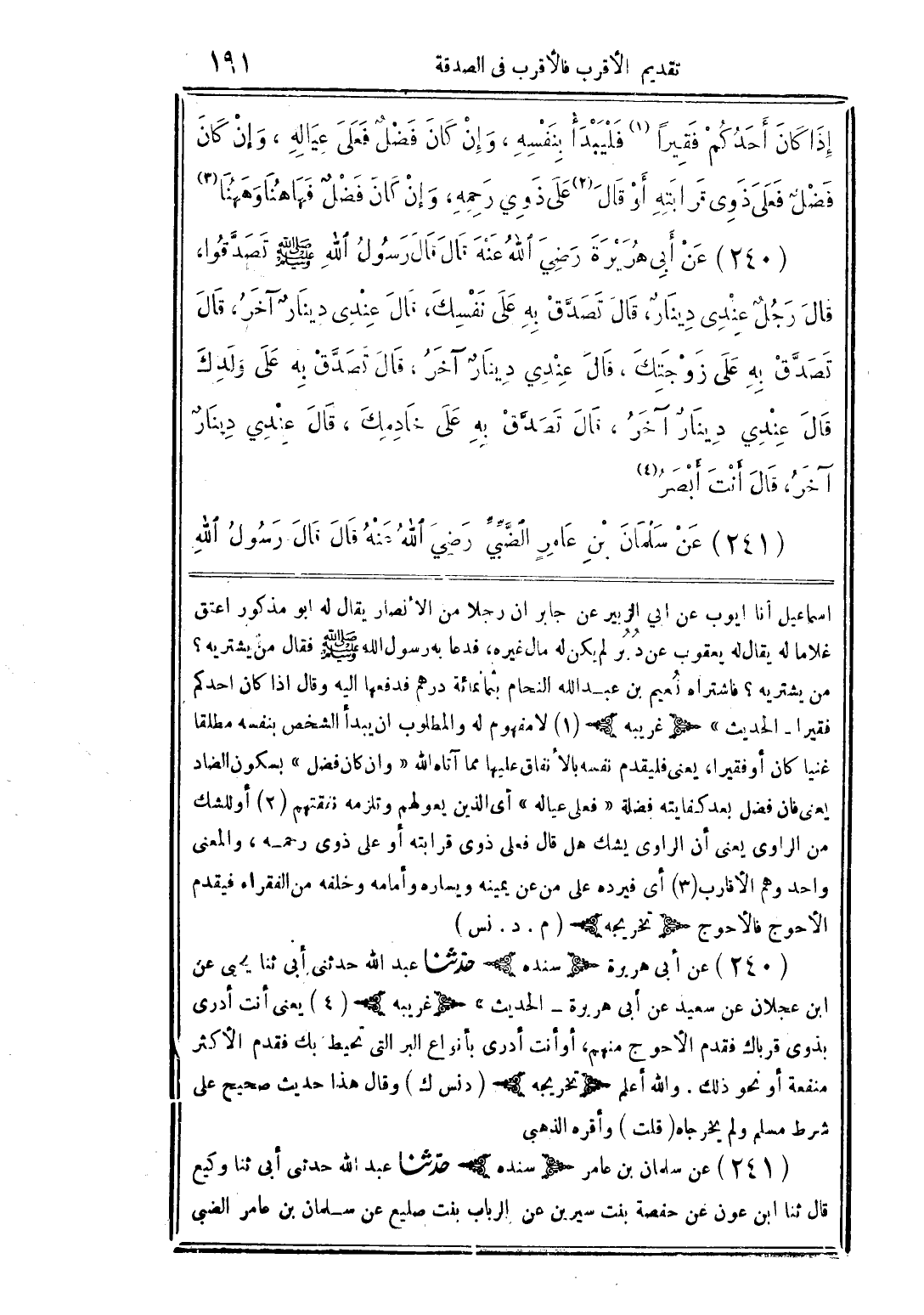 (240) عن أبى هريرة رضي الله عنه قال قال رسول الله صلى الله عليه وسلم تصدَّقوا، قال رجلٌ عندى دينارٌ، قال تصدَّق به على نفسك، قال عندى دينارٌ آخر، قال تصدَّق به على زوجتك، قال عندي دينارٌ آخر، قال تصدَّق به على ولدك قال عندي دينارٌ آخر، قال تصدَّق به على خادمك، قال عندي دينارٌ آخر، قال أنت أبصر (4)