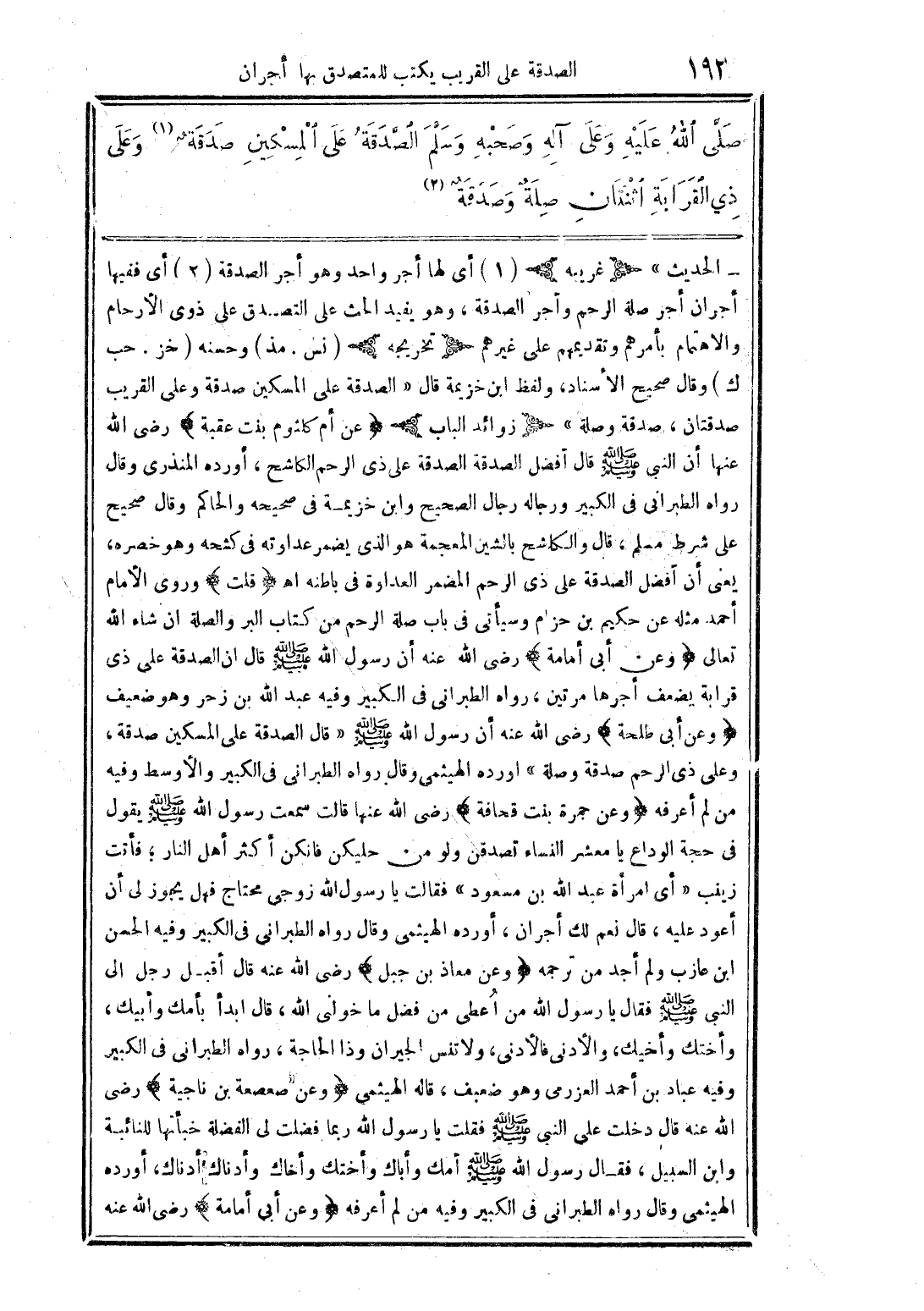 صلَّى الله عليه وعلى آله وصحبه وسلَّم الصَّدقة على المسكين صدقةٌ (1) وعلى ذي القرابة اثنتان صلةٌ وصدقةٌ (2)