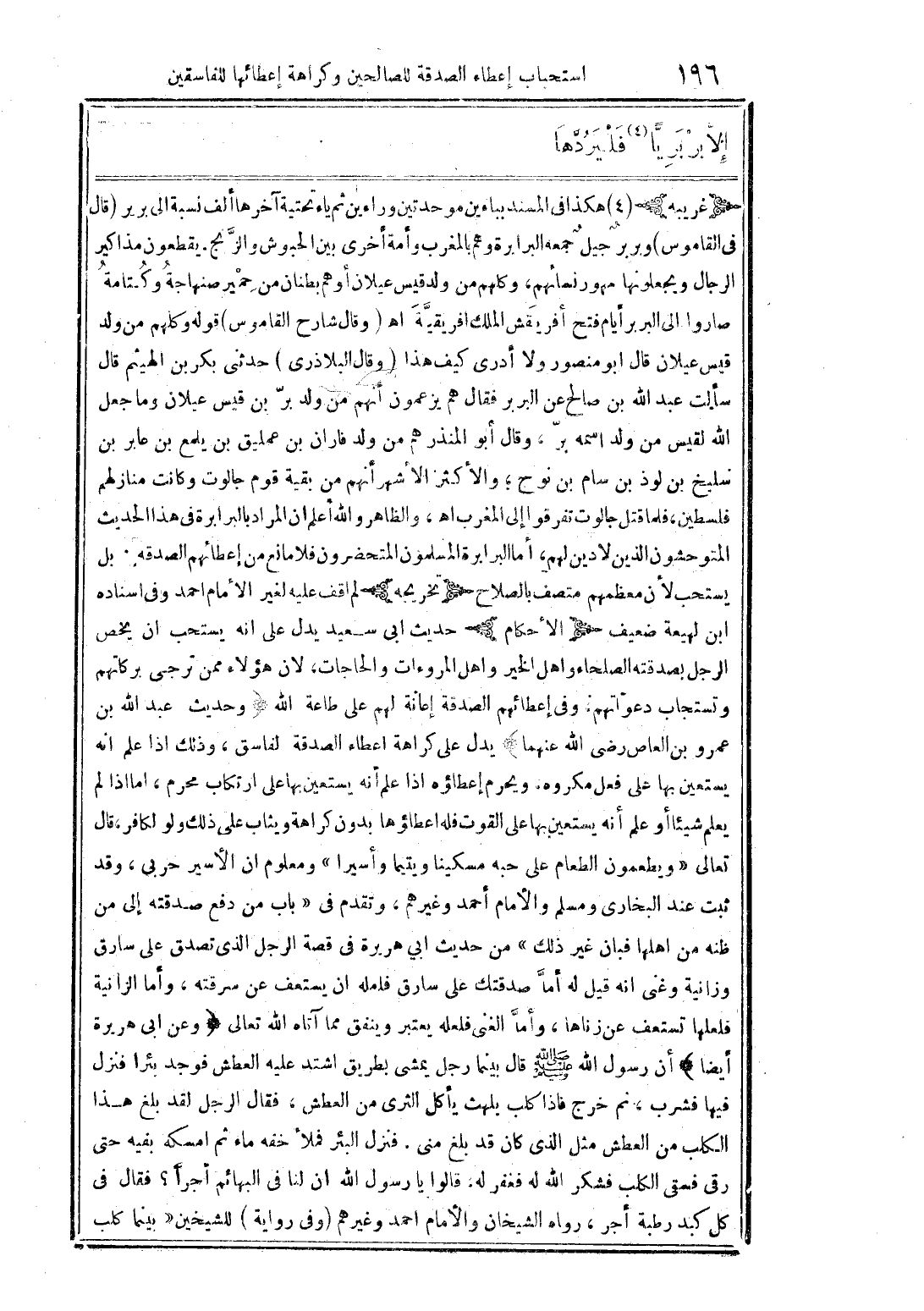 (غريبه) (4) هكذا فى المسند بباءين موحدتين وراء بن ثم ياء تحتية آخرها ألف نسبة الى بربر (قال فى القاموس) وبربرٌ جيلٌ جمعه البرابرة وهم بالمغرب وأمة أخرى بين الحبوش والزَّنج. يقطعون مذاكير الرجال ويجعلونها مهور نسائهم، وكلهم من ولد قيس عيلان أوهم بطنان من حمير صنهاجة وكتامة صاروا الى البربر أيام فتح أفريقش الملك افريقيَّة اهـ (وقال شارح القاموس) قوله وكلهم من ولد قيس عيلان قال ابو منصور ولا أدرى كيف هذا (وقال البلاذرى) حدثدنى بكر بن الهيثم قال سألت عبد الله بن صالح عن البربر فقال هم يزعمون أنهم من ولد برّ بن قيس عيلان وما جعل الله لقيس من ولد اسمه برّ، وقال أبو المنذر هم من ولد فاران بن عمليق بن يلمع بن عابر بن سليخ بن لوذ بن سام بن نوح؛ والأكثر الأشهر من بقية قوم جالوت وكانت منازلهم فلسطين، فلما قتل جالوت تفرقوا إلى المغرب اهـ، والظاهر والله أعلم ان المراد بالبرابرة فى هذا الحديث المتوحشون الذين لا دين لهم، أما البرابرة المسلمون المتحضرون فلا مانع من إعطائهم الصدقه. بل يستحب لأن معظمهم متصف بالصلاح (تخريجه) لم اقف عليه لغير الأمام احمد وفى اسناده ابن لهيعة ضعيف (الأحكام) حديث ابى سعيد يدل على انه يستحب ان يخص الرجل بصدقته الصلحاء واهل الخير واهل المروءات والحاجات، لان هؤلاء ممن ترجى بركاتهم وتستجاب دعواتهم، وفى إعطائهم الصدقة إعانة لهم على طاعة الله (وحديث عبد الله بن عمرو بن العاص رضى الله عنهما) يدل على كراهة اعطاء الصدقة لفاسق، وذلك اذا علم انه يستعين بها على فعل مكروه، ويحرم إعطاؤه اذا علم أنه يستعين بها على ارتكاب محرم، اما اذا لم يعلم شيئا أو علم أنه يستعين بها على القوت فله اعطاؤها بدون كراهة ويثاب على ذلك ولو لكافر، قال تعالى "ويطعمون الطعام على حبه مسكينا ويتيما وأسيرا" ومعلوم ان الأسير حربى، وقد ثبت عند البخارى ومسلم والأمام أحمد وغيرهم، وتقدم فى "باب من دفع صدقته إلى من ظنه من اهلها فبان غير ذلك" من حديث ابي هريرة فى قصة الرجل الذى تصدق على سارق وزانية وغنى انه قيل له أمَّا صدقتك على سارق فلعله ان يستعف عن سرقته، وأما الزانية فلعلها تستعف عن زناها، وأمَّا الغنى فلعله يعتبر وينفق مما آتاه الله تعالى (وعن ابى هريرة أيضا) أن رسول الله صلى الله عليه وسلم قال بينما رجل يمشى بطريق اشتد عليه العطش فوجد بئرا فنزل فيها فشرب، ثم خرج فاذا كلب يلهث يأكل الثرى من العطش، فقال الرجل لقد بلغ هذا الكلب من العطش مثل الذى كان قد بلغ منى. فنزل البئر فملأ خفه ماء ثم امسكه بفيه حتى رقى فسقى الكلب فشكر الله له فغفر له، قالوا يا رسول الله ان لنا فى البهائم أجرًا؟ فقال فى كل كبد رطبة أجر، رواه الشيخان والأمام احمد وغيرهم (وفى رواية) للشيخين "بينما كلب