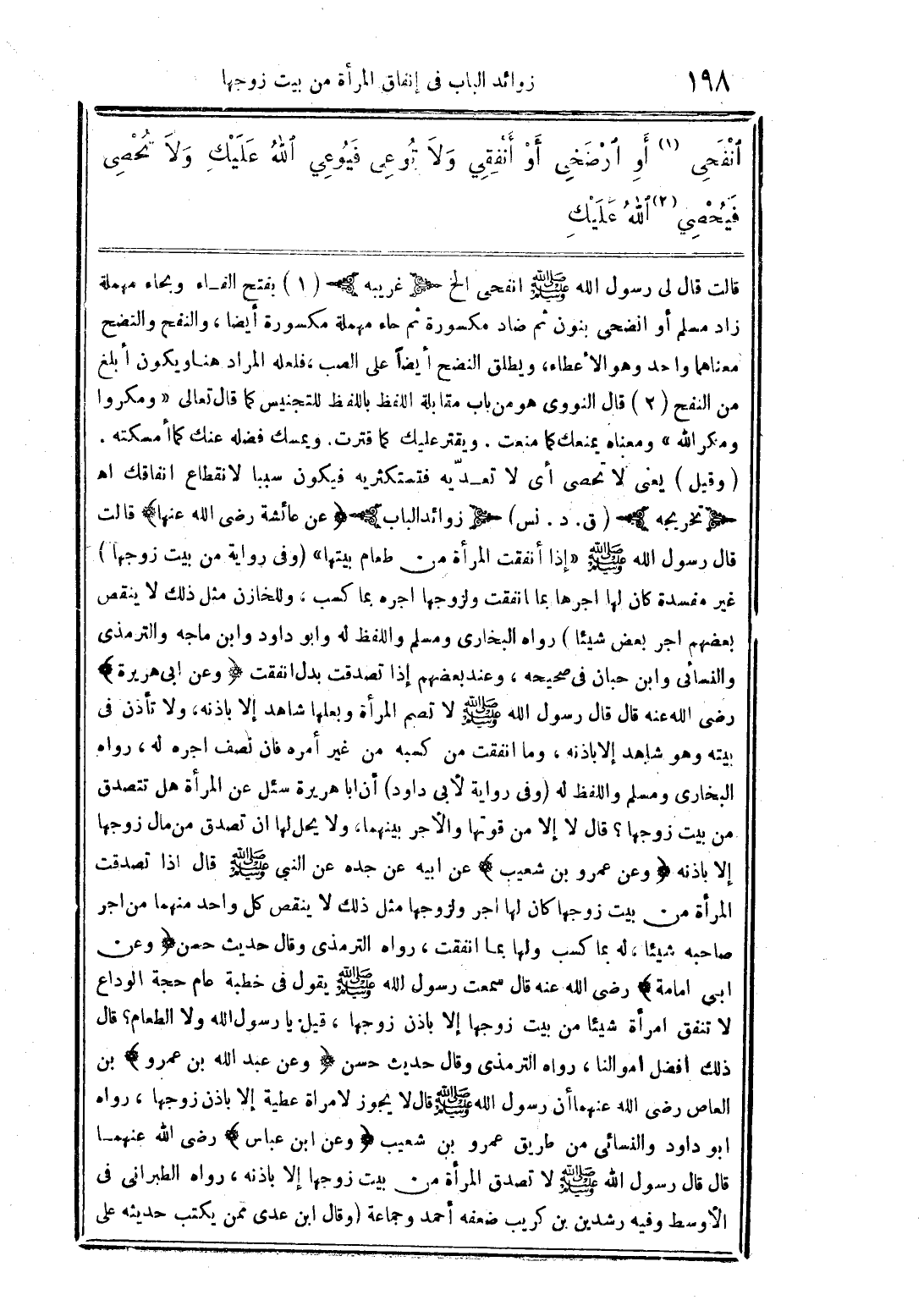 قالت قال لي رسول الله صلى الله عليه وسلم انفحى الخ (غريبه) (1) بفتح الفاء وبحاء مهملة زاد مسلم أو انضحى بنون ثم ضاد مكسورة ثم حاء مهملة مكسورة أيضا، والنقح والتضح معناهما واحد وهو الأعطاء، ويطلق النضح أيضًا على الصب، فلعله المراد هنا ويكون أبلغ من النفح (2) قال النووى هو من باب مقابلة اللفظ باللفظ للتجنيس كما قال تعالى {ومكروا ومكر الله} ومعناه يمنعك كما منعت. ويقتر عليك كما قترت. ويمسك فضله عنك كما أمسكته. (وقيل) يعنى لا تحصى أى لا تعدّيه فتستكثريه فيكون سببا لانقطاع انفاقك اهـ (تخريجه) (ق. د. نس) (زوائد الباب) (عن عائشة رضى الله عنها) قالت قال رسول الله صلى الله عليه وسلم "إذا أنفقت المرأة من طعام بيتها" (وفى رواية من بيت زوجها) غير مفسدة كان لها اجرها بما انفقت ولزوجها اجره بما كسب، وللخازن مثل ذلك لا ينقص بعضهم اجر بعض شيئا) رواه البخارى ومسلم واللفظ له وابو داود وابن ماجه والترمذى والنسائى وابن حبان فى صحيحه، وعند بعضهم إذا تصدقت بدل انفقت (وعن ابى هريرة) رضى الله عنه قال قال رسول الله صلى الله عليه وسلم لا تصم المرأة وبعلها شاهد إلا باذنه، ولا تأذن فى بيته وهو شاهد إلا باذنه، وما انفقت من كسبه من غير أمره فان نصف اجره له، رواه البخارى ومسلم واللفظ له (وفى رواية لأبى داود) أن ابا هريرة سئل عن المرأة هل تتصدق من بيت زوجها؟ قال لا إلا من قوتها والأجر بينهما، ولا يحل لها ان تصدق من مال زوجها إلا باذنه (وعن عمرو بن شعيب) عن ابيه عن جده عن النبى صلى الله عليه وسلم قال اذا تصدقت المرأة من بيت زوجها كان لها اجر ولزوجها مثل ذلك لا ينقص كل واحد منهما من اجر صاحبه شيئا، له بما كسب ولها بما انفقت، رواه الترمذى وقال حديث حسن (وعن ابى امامة) رضى الله عنه قال سمعت رسول الله صلى الله عليه وسلم يقول فى خطبة عام حجة الوداع لا تنفق امرأة شيئا من بيت زوجها إلا باذن زوجها، قيل يا رسول الله ولا الطعام؟ قال ذلك افضل اموالنا، رواه الترمذى وقال حديث حسن (وعن عبد الله بن عمرو) بن العاص رضى الله عنهما أن رسول الله صلى الله عليه وسلم قال لا يجوز لامراة عطية إلا باذن زوجها، رواه ابو داود والنسائى من طريق عمرو بن شعيب (وعن ابن عباس) رضى الله عنهما قال قال رسول الله صلى الله عليه وسلم لا تصدق المرأة من بيت زوجها إلا باذنه، رواه الطبرانى فى الأوسط وفيه رشدين بن كريب ضعفه أحمد وجماعة (وقال ابن عدى ممن يكتب حديثه على