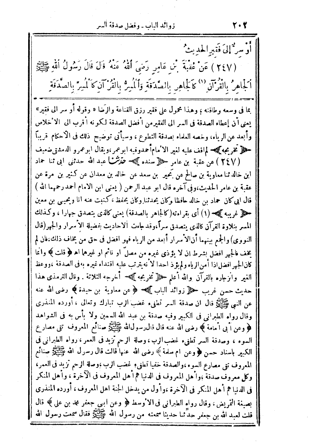 (247) عن عقبة بن عامرٍ رضى الله عنه قال قال رسول الله صلى الله عليه وسلم الجاهز بالقرآن (1) كالجاهر بالصَّدقة والمسرُّ بالقرآن كالمسرِّ بالصَّدقة