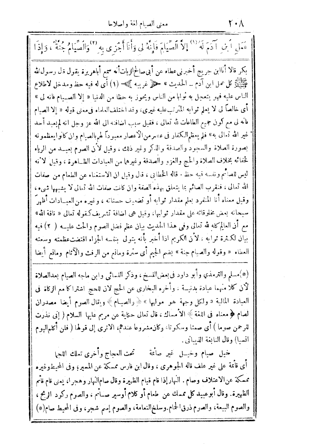 (*) مسلم والترمذي وأبو داود فى بعض النسخ، وذكر النسائى وابن ماجه الصيام بعد الصلاة لأن كلا منهما عبادة بدنية، وأخره البخارى عن الحج لان للحج اشتراكما مع الزكاة فى العبادة المالية "ولكل وجهة هو موليها" (والصيام) ويقال الصوم أيضا مصدران لصام (معناه فى اللغة) الأمساك، قال تعالى حكاية عن مريم عليها السلام {إنى نذرت للرحمن صوما} أى صمتا وسكوتا، وكان مشروعا عندهم، الا ترى إلى قولها {فلن أكلم اليوم انسيا} وقال النابغة الذبيانى.