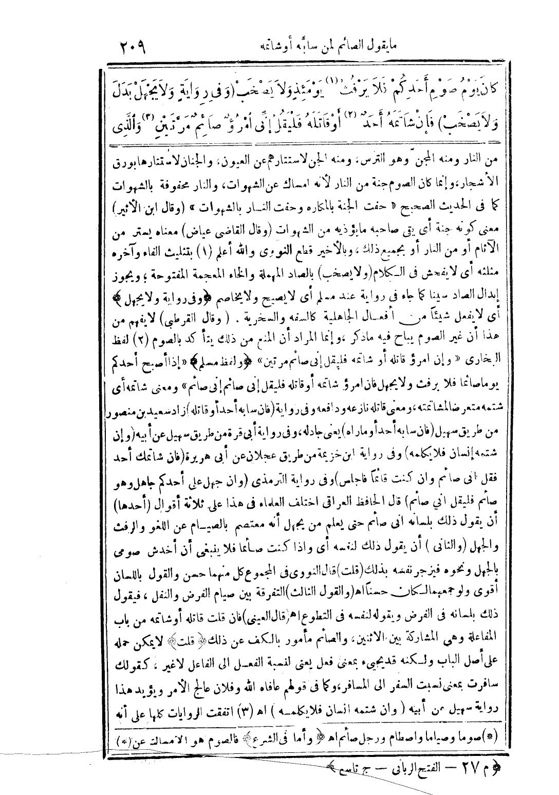 من النار ومنه المجنّ وهو الترس، ومنه الجن لاستتارهم عن العيون، والجنان لاستتارها بورق الأشجار، وإنما كان الصوم جنة من النار لأنه امساك عن الشهوات، والنار محفوفة بالشهوات كما فى الحديث الصحيح "حفت الجنة بالمكاره وحفت النار بالشهوات" (وقال ابن الأثير) معنى كونه جنة أى يقى صاحبه ما يؤذيه من الشهوات (وقال القاضى عياض) معناه يستر من الآثام أو من النار أو بجميع ذلك، وبالأخير قطع النووى والله أعلم (1) بتثليث الفاء وآخره مثلثه أى لا يفحش فى الكلام (ولا يصخب) بالصاد المهملة والخاء المعجمة المفتوحة؛ ويجوز إبدال الصاد سينا كما جاء فى رواية عند مسلم أى لا يصيح ولا يخاصم (وفى رواية ولا يجهل) أى لا يفعل شيئًا من أفعال الجاهلية كالسفه والسخرية. (وقال القرطبى) لا يفهم من هذا أن غير الصوم يباح فيه ما ذكر، وإنما المراد أن المنع من ذلك يتأكد بالصوم (2) لفظ البخارى "وإن امرؤ قاتله أو شاتمه فليقل إنى صائم مرتين" (ولفظ مسلم) "إذا أصبح أحدكم يوما صائما فلا يرفص ولا يجهل فان امرؤ شاتمه أو قاتله فليقل إنى صائم إنى صائم" ومعنى شاتمه أى شتمه متعرضا لمشاتمته، ومعنى قاتله نازعه ودافعه وفى رواية (فان سابه أحد أو قاتله) زاد سعيد بن منصور من طريق سهيل (فان سابه أحد أو ماراه) يعنى جادله، وفى رواية أبى قرة من طريق سهيل عن أبيه (وإن شتمه إنسان فلا يكلمه) وفى رواية ابن خزيمة من طريق عجلان عن أبى هريرة (فان شاتمك أحد فقل انى صائم وان كنت قائمًا فاجلس) وفى رواية الترمذى (وان جهل على أحدكم جاهل وهو صائم فليقل اني صائم) قال الحافظ العراقى اختلف العلماء فى هذا على ثلاثة أقوال (أحدها) أن يقول ذلك بلسانه انى صائم حتى يعلم من يجهل أنه معتصم بالصيام عن اللغو والرفث والجهل (والثانى) أن يقول ذلك لنفسه أى واذا كنت صائما فلا ينبغى أن أخدش صومى بالجهل ونحوه فيزجر نفسه بذلك (قلت) قال النووى فى المجموع كل منهما حسن والقول باللسان أقوى ولو جمعهما لكان حسنًا اهـ (والقول الثالث) التفرقة بين صيام الفرض والنفل، فيقول ذلك بلسانه فى الفرض ويقول لنفسه فى التطوع اهـ (قال العينى) فان قلت قاتله أو شاتمه من باب المفاعلة وهى المشاركة بين الاثنين، والصائم مأمور بالكف عن ذلك (قلت) لا يمكن حمله على أصل الباب ولكنه قد يجيئ بمعنى فعل يعنى لنسبة الفعل الى الفاعل لا غير، كقولك سافرت بمعنى نسبت السفر الى المسافر، وكما فى قولهم عافاه الله وفلان عالج الأمر ويؤيد هذا رواية سهيل عن أبيه (وان شتمه انسان فلا يكلمه) اهـ (3) اتفقت الروايات كلها على أنه