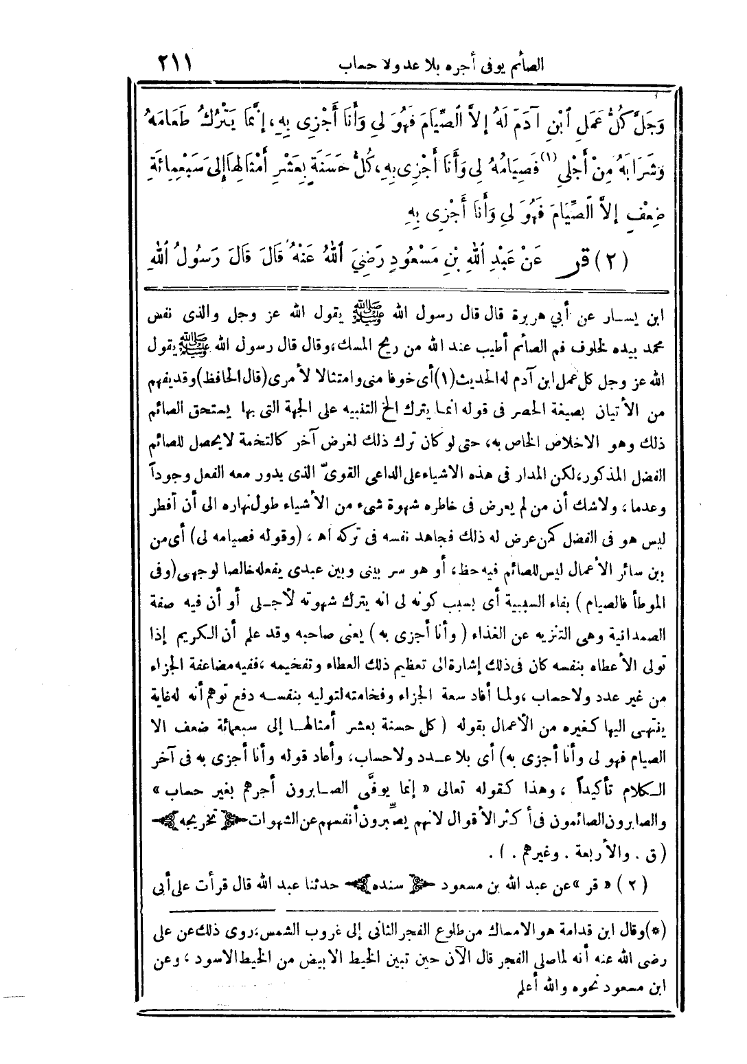 ابن يسار عن أبي هريرة قال قال رسول الله صلى الله عليه وسلم يقول الله عز وجل والذى نفس محمد بيده لخلوف فم الصائم أطيب عند الله من ريح المسك، وقال قال رسول الله صلى الله عليه وسلم يقول الله عز وجل كل عمل ابن آدم له الحديث (1) أى خوفا منى وامتثالا لأمرى (قال الحافظ) وقد يفهم من الأتيان بصيغة الحصر فى قوله انما يترك الخ التنبيه على الجهة التى بها يستحق الصائم ذلك وهو الاخلاص الخاص به، حتى لو كان ترك ذلك لغرض آخر كالتخمة لا يحصل للصائم الفضل المذكور، لكن المدار فى هذه الاشياء على الداعى القوى الذى يدور معه الفعل وجودًا وعدما، ولا شك أن من لم يعرض فى خاطره شهوة شئ من الأشياء طول نهاره الى أن أفطر ليس هو فى الفضل كمن عرض له ذلك فجاهد نفسه فى تركه اهـ، (وقوله فصيامه لى) أى من بين سائر الأعمال ليس للصائم فيه حظ، أو هو سر بينى وبين عبدى يفعله خالصا لوجهى (وفى الموطأ فالصيام) بفاء السببية أى بسبب كونه لى انه يترك شهوته لأجلى أو أن فيه صفة الصمدانية وهى التنزيه عن الغذاء (وأنا أجزى به) يعنى صاحبه وقد علم علم أن الكريم إذا تولى الأعطاه بنفسه كان فى ذلك إشارة الى تعظيم ذلك العطاء وتفخيمه، ففيه مضاعفة الجزاء من غير عدد ولا حساب، ولما أفاد سعة الجزاء وفخامته لتوليه بنفسه دفع توهم أنه له غاية ينتهى اليها كغيره من الأعمال بقوله (كل حسنة بعشر أمثالها إلى سبعمائة ضعف الا الصيام فهو لى وأنا أجزى به) أى بلا عدد ولا حساب، وأعاد قوله وأنا أجزى به فى آخر الكلام تأكيدًا، وهذا كقوله تعالى {إنما يوفَّى الصابرون أجرهم بغير حساب} والصابرون الصائمون فى أكثر الأقوال لانهم يصِّبرون أنفسهم عن الشهوات (تخريجه) (ق. والأربعة. وغيرهم.).