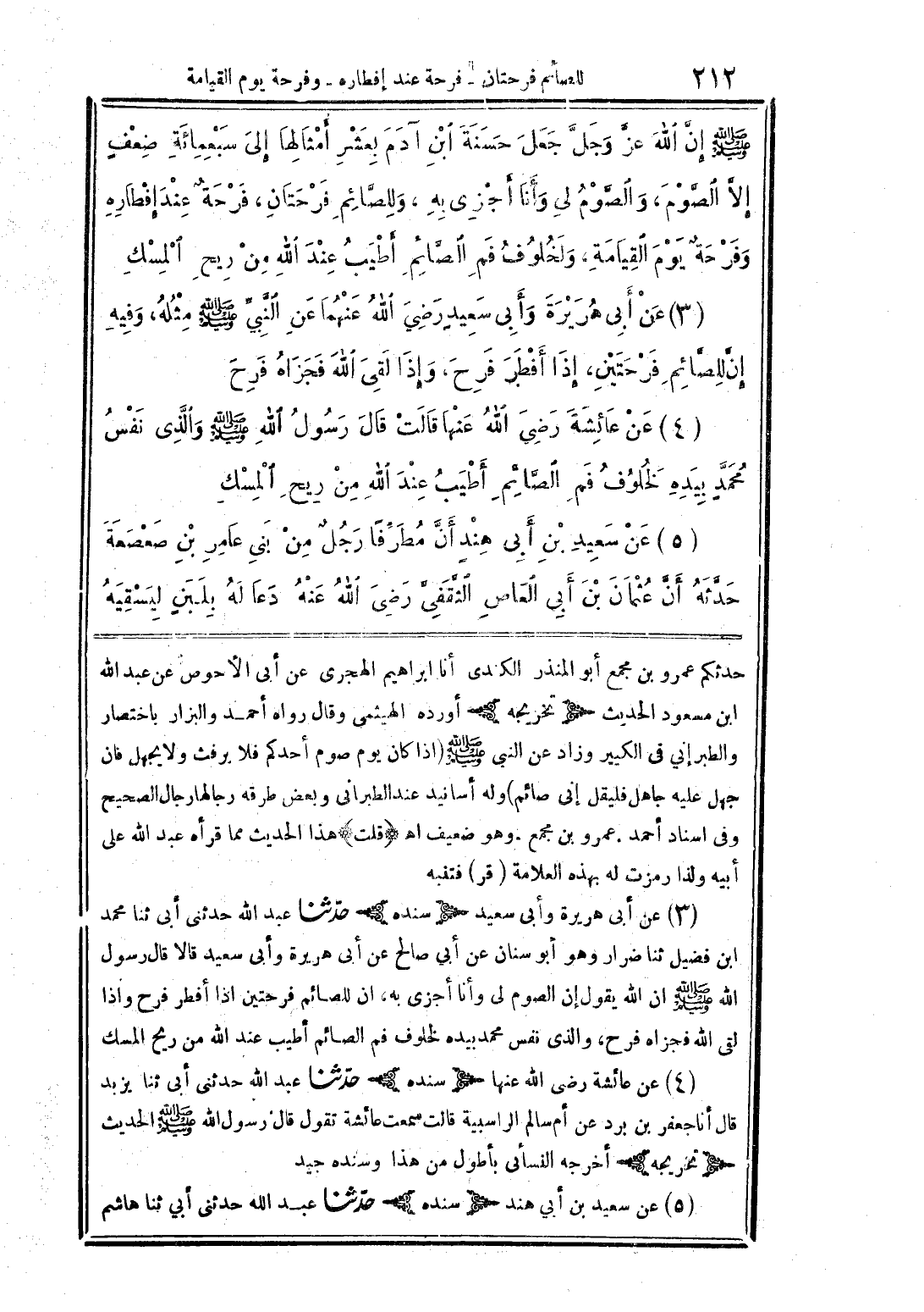 (3) عن أبى هريرة وأبى سعيدٍ رضي الله عنهما عن النَّبيِّ صلى الله عليه وسلم مثله، وفيه إنَّ للصَّائم فرحتين، إذا أفطر فرح، وإذا لقى الله فجزاه فرح
