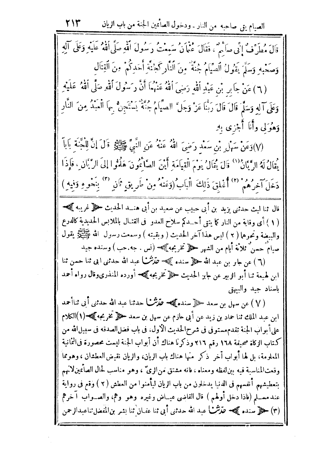 (7) وعن سهل بن سعد رضى الله عنه عن النَّبيِّ صلى الله عليه وسلم قال إنَّ للجنَّة بابًا يقال له الرَّيَّان (1) قال يقال يوم القيام أين الصَّائمون هلمُّوا إلى الرَّيَّان، فإذا دخل آخرهم (2) أغلق ذلك الباب (وعنه من طريقٍ ثانٍ (3) بنحوه وفيه)