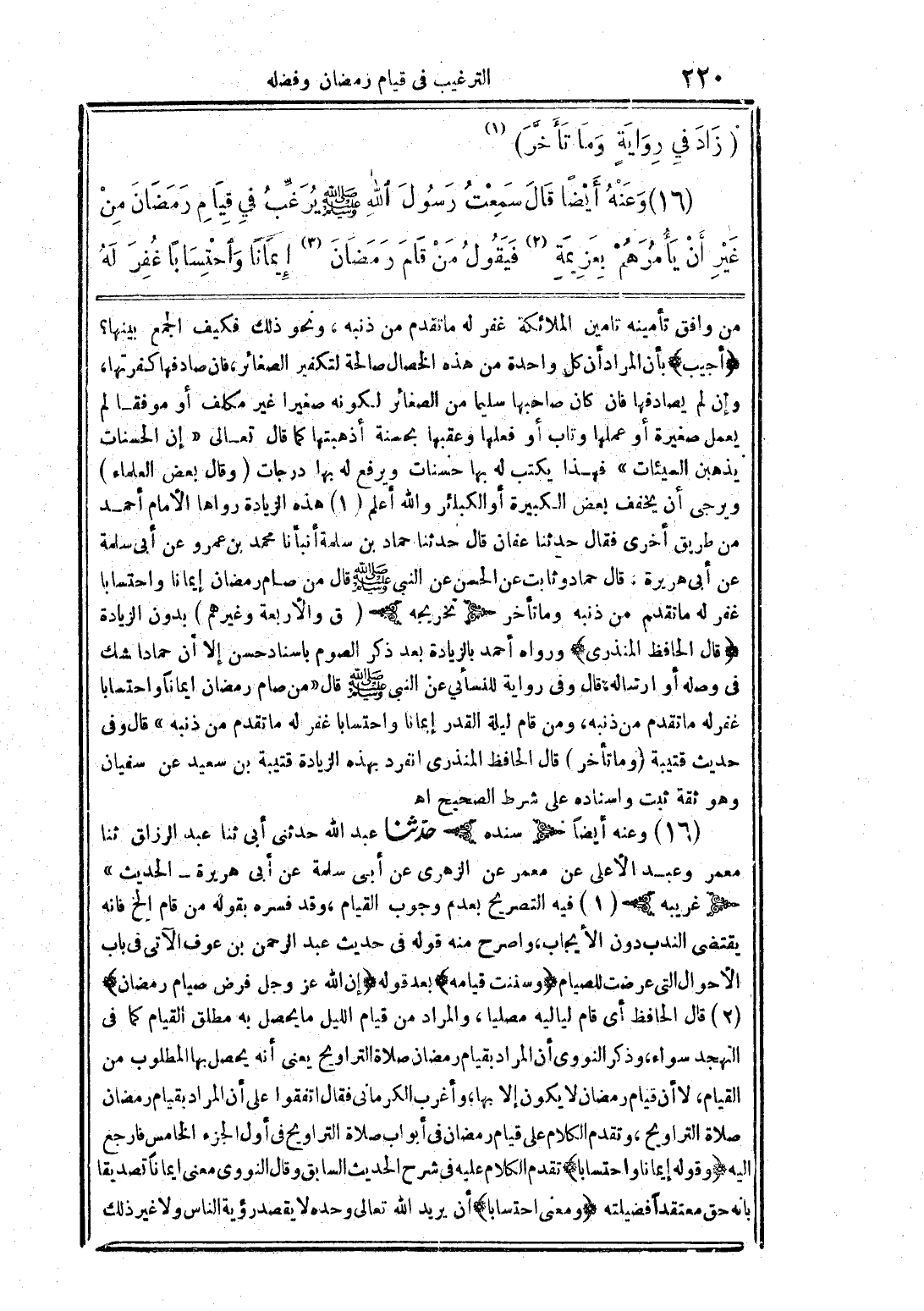 (16) وعنه أيضًا قال سمعت رسول الله صلى الله عليه وسلم يرغِّب فى قيام رمضان من غير أن يأمرهم بعزيمةٍ (2) فيقول من قام رمضان (3) إيمانًا واحتسابًا غفر له