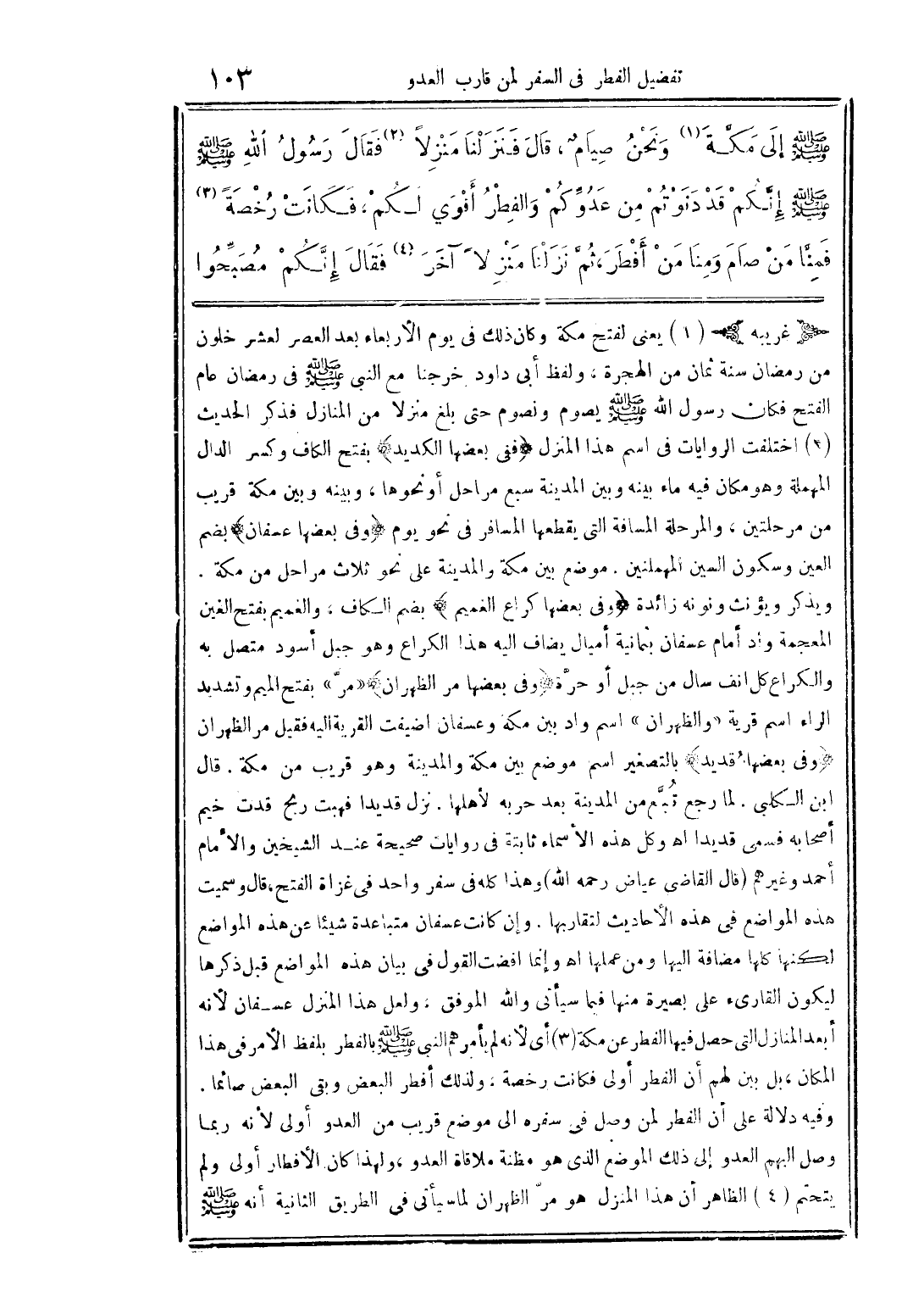 (غريبه) (1) يعني لفتح مكة وكان ذلك في يوم الأربعاء بعد العصر لعشر خلون من رمضان سنة ثمان من الهجرة، ولفظ أبى داود خرجنا مع النبي (صلى الله عليه وسلم) في رمضان عام الفتح فكان رسول الله (صلى الله عليه وسلم) يصوم ونصوم حتى بلغ منزلاً من المنازل فذكر الحديث (3) اختلفت الروايات في اسم هذا المنزل (ففي بعضها الكديد) بفتح الكاف وكسر الدال المهملة وهو مكان فيه ماء بينه وبين المدينة سبع مراحل أو نحوها، وبينه وبين مكة قريب من مرحلتين، والمرحلة المسافة التي يقطعها المسافر في نحو يوم (وفي بعضها عسفان) بضم العين والسكون السين المهملتين، موضع مكة والمدينة على نحو ثلاث مراحل من مكة، ويذكر ويؤنث ونونه زائدة (وفي بعضها كراع الغميم) بضم الكاف، والغميم بفتح الغين المعجمة واد أمام عسفان بثمانية أميال يضاف إليه هذا الكراع وهو جبل أسود متصل به والكراع كل أنف سال من جبل أو حرة (وفي بعضها من الظهران) (مرّ) بفتح الميم وتشديد الراء اسم قرية "والظهران" أسم واد بين مكة وعسفان أضيفت القرية إليه فقيل مر الظهران (وفي بعضها قديد) بالتصغير اسم موضع بين مكة والمدينة وهو قريب من مكة، قال ابن الكلبي، لما رجع تبع من المدينة بعد حربه لأهلها، نزل قديدًا فهبت ربح قدت خيم أصحابه سمي قديدًا أهـ وكل هذه الأسماء ثابتة في روايات صحيحة عند الشيخين والإمام أحمد وغيرهم (قال القاضي عياض رحمه الله) وهذا كله في سفر واحد في غزاة الفتح، قال وسميت هذه المواضع في هذه الأحاديث لتقاربها، وإن كان عسفان متباعدة شيئًا عن هذه المواضع لكنها كلها مضافة إليها ومن عملها أهـ وإنما أفضت القول في بيان هذه المواضع قبل ذكرها ليكون القارئ على بصيرة منها فيما سيأتي والله الموفق، ولعل هذا المنزل عسفان لأنه أبعد المنازل التي حصل فيها الفطر عن مكة (3) أي لأنه لم يأمرهم النبي (صلى الله عليه وسلم) بالفطر بلفظ الأمر في هذا المكان، بل بين لهم أن الفطر أولى فكانت رخصة، ولذلك أفطر البعض وبقي البعض صائمًا وفيه دلالة على أن الفطر لمن وصل في سفره إلى موضع قريب من العدو أولى لأنه ربما وصل إليهم العدو إلى ذلك الموضع الذي هو مظنة ملاقاة العدو، ولهذا كان الإفطار أولى ولم يتحتم (4) الظاهر أن هذا المنزل هو مرّ الظهر أن لما سيأتي في الطريق الثانية أنه (صلى الله عليه وسلم)