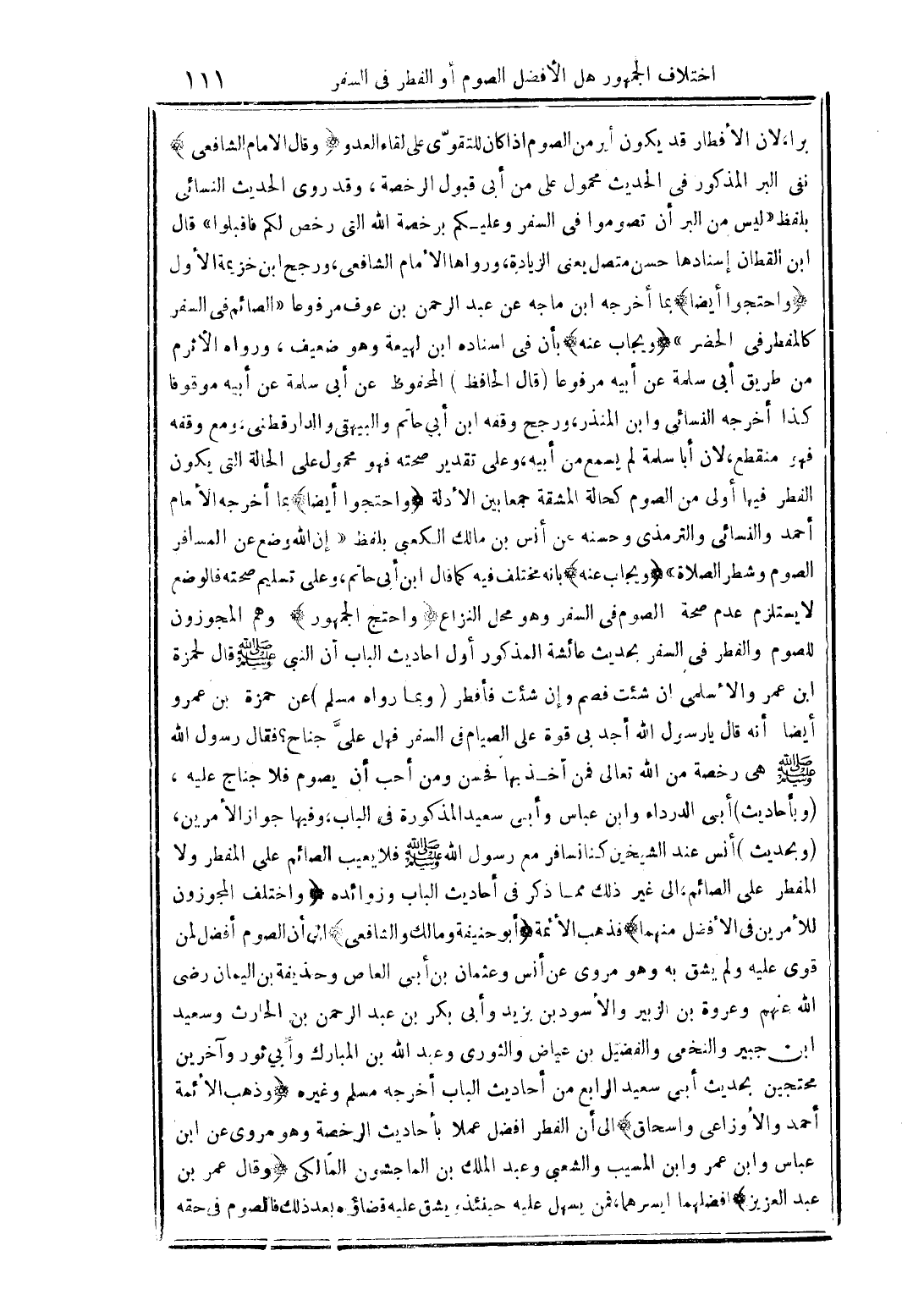 برا، لأن الإفطار قد يكون أبر من الصوم إذا كان للتقوّي على لقاء العدو (وقال الإمام الشافعي) نفي البر المذكور في الحديث محمول على من أبى قبول الرخصة، وقد روي الحديث النسائي بلفظ (ليس من البر أن تصوموا في السفر وعليكم برخصة الله التي رخص لكم فاقبلوا" قال ابن القطان إسنادها حسن متصل يعني الزيادة، ,رواها الإمام الشافعي، ورجح ابن خزيمة الأول (واحتجوا أيضًا) بما أخرجه ابن ماجه عن عبد الرحمن بن عوف مرفوعًا "الصائم على السفر كالمفطر في الحضر) (ويجاب عنه) بأن في إسناده ابن لهيعة وهو ضعيف، ورواه الأثرم من طريق أبى سلمة عن أبيه مرفوعًا (قال الحافظ) المحفوظ عن أبى سلمة عن أبيه موقوقًا كذا أخرجه النسائي وابن المنذر، ورجح وقفه ابن أبى حاتم والبيهقي والدارقطني، ومع وقفه فهو منقطع، لأن أبا سلمة لم يسمع من أبيه، وعلى تقدير صحته فهو محمول على الحالة التي يكون الفطر فيها أولى من الصوم كحالة المشقة جمعًا بين الأدلة (واحتجوا أيضًا) بما أخرجه الإمام أحمد والنسائي والترمذي وحسنه عن أنس بن مالك الكعبي بلفظ "إن الله وضع عن المسافر الصوم وشطر الصلاة" (ويجاب عنه) بأنه مختلف فيه كما قال أنه أبى حاتم، وعلى تسليم صحته فالوضع لا يستلزم عدم صحة الصوم في السفر وهو محل النزاع (واحتج الجمهور) وهم المجوزون للصوم والفطر في السفر بحديث عائشة المذكور أول أحاديث الباب أن النبي (صلى الله عليه وسلم) قال لحمزة ابن عمر الأسلمي إن شئت فصم وإن شئت فافطر (وبما رواه مسلم) عن حمزة بن عمرو أيضًا أنه قال يا رسول الله أجد بي قوة على الصيام في السفر فهل على جناح؟ فقال رسول الله (وبأحاديث) أبى الدرداء وأبن عباس وأبى سعيد المذكورة في الباب، وفيها جواز الأمرين، (وبحديث) أنس عند الشيخين كنا نسافر مع رسول الله (صلى الله عليه وسلم) فلا يعب الصائم على المفطر ولا المفطر على الصائم، إلى غير ذلك مما ذكر في أحاديث الباب وزوائده (واختلف المجوزون للأمرين في الأفضل منهما) فذهب الأئمة (أبو حنيفة ومالك والشافعي) إلى أن الصوم أفضل لمن قوي عليه ولم يشق به وهو مروي عن أنس وعثمان بن أبى العاص وحذيفة بن اليمان رضي الله عنهم وعروة بن الزبير والأسود بن يزيد وأبى بكر بن عبد الرحمن بن الحارث وسعيد ابن جبير والنخعي والفضيل بن عياض والثوري وبعد الله بن المبارك وأبى ثور وآخرين محتجين بحديث أبى سعيد الرابع من أحاديث الباب أخرجه مسلم وغيره (وذهب الأئمة أحمد والأوزاعي وإسحاق) إلى أن الفطر أفضل عملاً بأحاديث الرخصة وهو مروي عن ابن عباس وابن عمر وابن المسيب والشعبي وعبد الملك بن الماجشون المالكي (وقال عمر بن ابن عبد العزيز) أفضلهما أيسرهما، فمن يسهل عليه حينئذ، يشق عليه قضاؤه بعد ذلك فالصوم في حقه