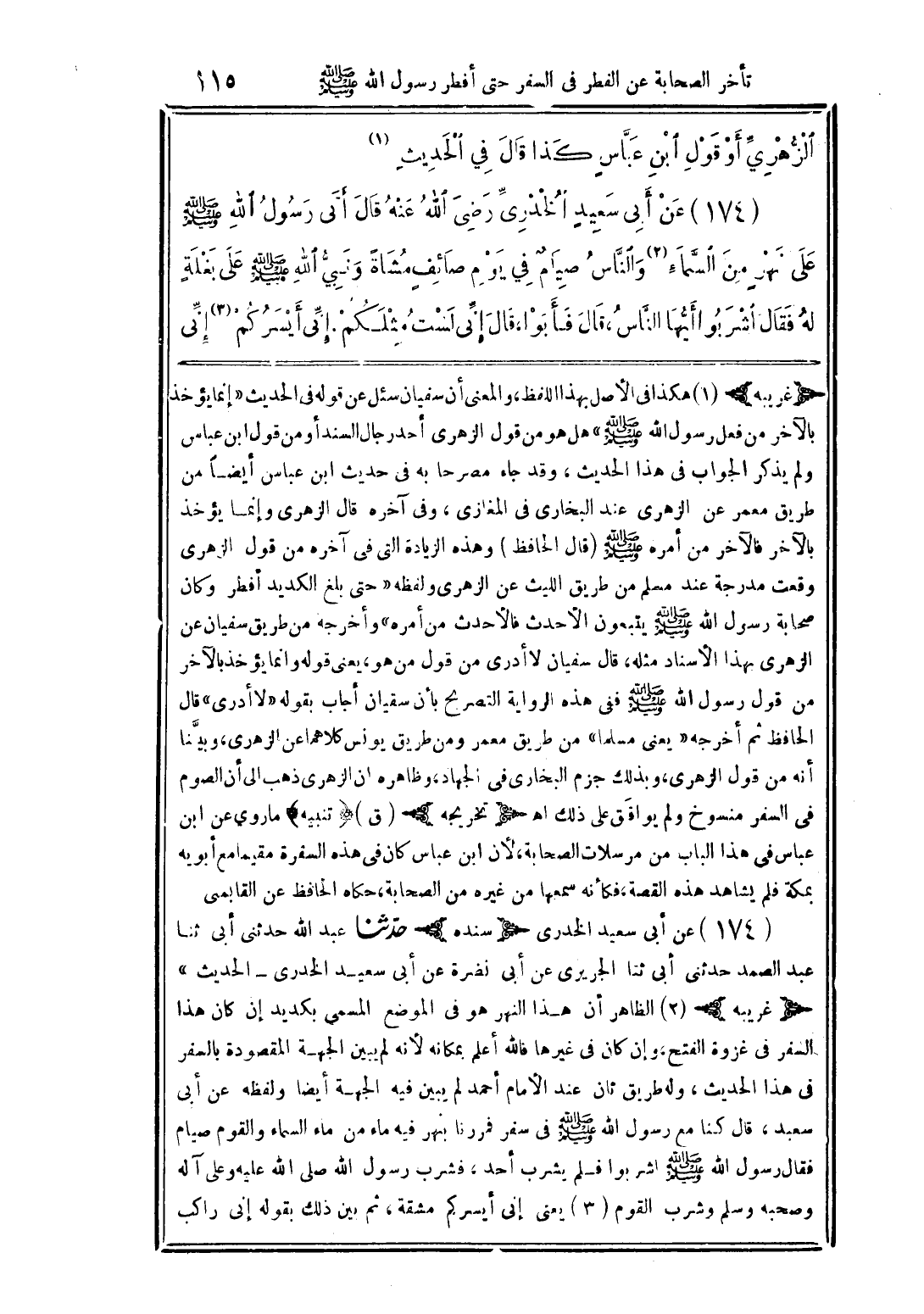 (174) عن أبى سعيد الخدري (سنده) حدّثنا عبد الله حدثني أبى ثنا عبد الصمد حدثني أبى ثنا الجريري عن أبى نضرة عن أبى سعيد الخدري - الحديث" (غريبة) (2) الظاهر أن هذا النهر هو في الموضع المسمي بكديد إن كان هذا المفر في غزوة الفتح، وإن كان في غيرها فالله أعلم بمكانه لأنه لم يبين الجهة المقصود بالمفر في هذا الحديث، وله طريق ثان عند الإمام أحمد لم يبين فيه الجهة أيضًا ولفظه عن أبى سعيد، قال كنا مع رسول الله (صلى الله عليه وسلم) في سفر فمررنا بنهر فيه ماء من ماء السماء والقوم صيام فقال رسول الله (صلى الله عليه وسلم) اشربوا فلم يشرب أحد، فشرب رسول الله (صلى الله عليه وعلى آله وصحبه وسلم وشرب القوم (3) يعني إني أيسركم مشقة، ثم بين ذلك بقوله إني راكب