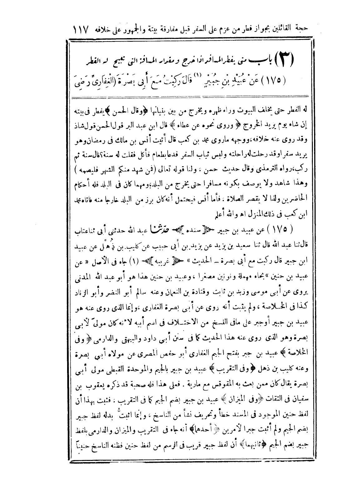 (175) عن عبيد بن جبير (سنده) حدّثنا عبد الله حدثني أبى ثنا عتاب قال ثنا عبد الله قال ثنا سعيد بن يزيد عن يزيد بن أبى حبيب عن كليب بن ذهل عن عبيد ابن جبير قال ركبت مع أبى بصر - الحديث" (غريبة) (1) جاء في الأصل "عن عبيد بن حنين" بحاء مهملة ونونين مصغرًا، وعبيد بن حنين هذا هو أبو عبد الله المدني يروي عن أبى موسي وزيد بن ثابت وقتادة بن النعمان وعنه سالم أبو النضر وأبو الزناد كذا في الخلاصة، ولم يثبت أنه روي عن أبى بصرة الغفاري، وإنما الذي روي عنه هو عبيد بن جبير أو جبر على ما في النسخ من الاختلاف في اسم أبية لأنه كان مولى لأبي بصرة وهو الذي روي عنه هذا الحديث كما في سنن أبى داود والبيهقي والدرامي (وفي الخلاصة) عبيد بن جبر بفتح الجيم الغفاري أبو حفص المصري عن مولاه أبى بصرة وعنه كليب بن ذهل (وفي التقريب) عبيد بن جبير بالجيم والموحدة القبطي مولي أبى بصرة يقال كان من بعث به المقوقس مع مارية، فعلى هذا فله صحبه قد ذكره يعقوب بن سفيان في الثقات (وفي الميزان) عبيد بجبير بضم الجيم كما في التقريب: فثبت بهذا أن لفظ حنين الموجود في المسند خطأ وتحريف نشأ من الناسخ، وإنما أثبت بدله لفظ جبير بضم الجيم ولم أثبت جبر لأمرين (أحدهما) أنه جاء في التقريب والميزان والدرامي بلفظ جبير بضم الجيم (ثانيهما) أن لفظ جبير قريب في الرسم من لفظ حنين فظنه الناسخ حنينًا