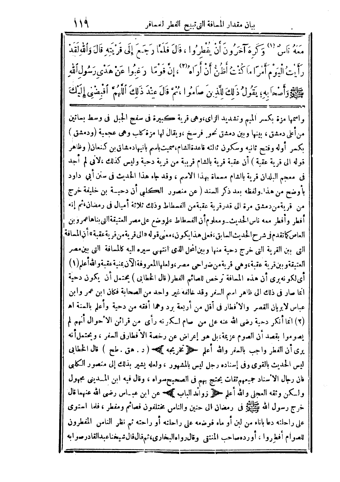 واسمها مزة بكسر الميم وتشديد الزاي، وهي قرية كبيرة في سفح الجبل في وسط بساتين من أعلى دمشق، بينها وبين دمشق نحو فرسخ، ويقال لها مزة كلب وهي عجيمة (ودمشق) بكسر أوله وفتح ثانية وسكون ثالثة قاعدة الشام، سميت باسم بانيها ده مشاق بن كنعان (وظاهر قوله إلى قرية عقبة) أن عقبة قرية بالشام، سميت باسم بانهياد مشاق بن كنعان (وظاهر قوله إلى قرية عقبة) أن عقبة قرية بالشام قريبة من قرية دحية وليس كذلك، لأني لم أجد في معجم البلدان قرية بالشام مسماة بهذا الاسم، وقد جاء هذا الحديث في سنن أبى داود بأوضح من هذا ولفظه بعد ذكر السند (عن منصور الكلبي أن دحيه بن خليفة خرج من قرية من دمشق مرة على قدر قرية عقبة من الفسطاط وذلك ثلاثة أميال في رمضان، ثم إنه أفطر وأفطر معه ناس الحديث- ومعلوم أن الفسطاط علم وضع على مصر العتيقة التي بناها عمرو بن العاص كما تقدم في شرح الحديث السابق، فعلى هذا يكون، معني قوله "إلى قرية من قرية عقبة" أن المسافة التي بين القرية التي خرج دحيه منها وبني المحل الذي انتهي سيرة إليه كالمسافة التي بين مصر العتيقة وبين قرية عقبة، وهي قرية من ضواحي مصر، ولعلها المعروفة الآن بمنية عقبة والله أعلم (1) أي لكونه يري أن هذه المسافة ترخص للصائم الفطر (قال الخطابي) يحتمل أن يكون دحية إنما صار في ذلك إلى ظاهر اسم السفر وقد خالفه غير واحد من الصحابة فكان ابن عمر وابن عباس لا يريان القصر والإفطار في أقل من أربعة برد وهما أفقه من دحيه وأعلم بالسنة أهـ (2) إنما أنكر دحيه رضي الله عنه على من صام لكونه رأي من قرائن الأحوال أنهم لم يصوموا بقصد أن الصوم عزيمة، بل هو إعراض عن رخصة الإفطار في السفر، ويحتمل أنه يري أن الفطر واجب بالسفر والله أعلم (تخريجه) (د. هق. طح) قال الخطابي ليس الحديث بالقوي وفي إسناده رجل ليس بالمشهور، ولعله يشير بذلك إلى منصور الكلبي فإن رجال الإسناد جميعهم ثقات يحتج بهم في الصحيح سواه، وقال فيه ابن المديني مجهول ولكن وثقه العجلي والله أعلم (زوائد الباب) عن ابن عباس رضي الله عنهما قال خرج رسول الله (صلى الله عليه وسلم) في رمضان إلى حنين والناس مختلفون فصائم ومفطر، فلما استوي على راحلته دعا بإناء من لبن أو ماء فوضعه على راحلته أو راحته ثم نظر الناس المفطرون للصوام أفطروا، أورده صاحب المنتفي وقال رواه البخاري، ثم قال قال شيخنا عبد القادر صوابه