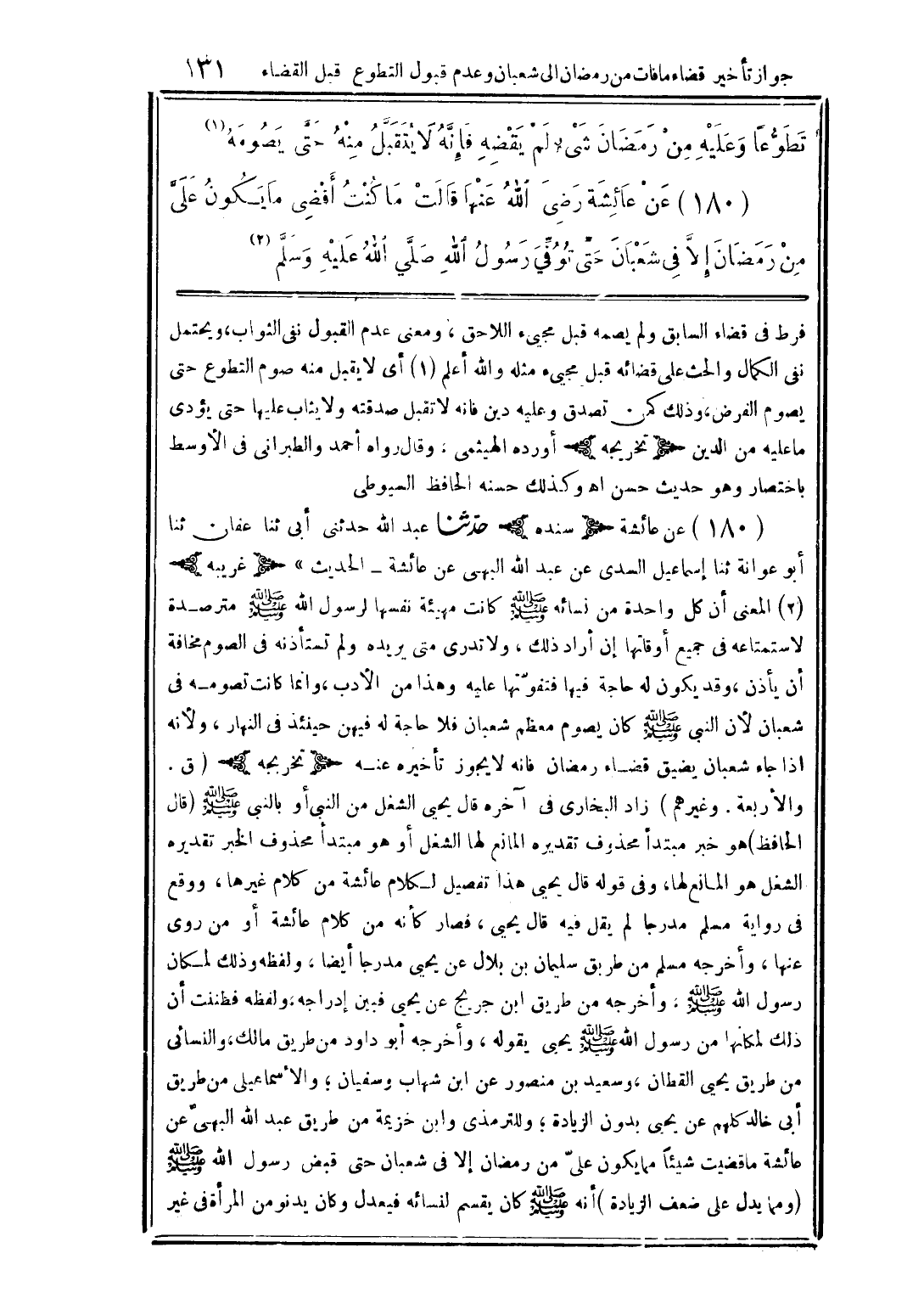 (180) عن عائشة رضي الله عنها قالت ما كنت أقضي ما يكون على من رمضان إلا في شعبان حتى توفي رسول الله (صلى الله عليه وسلم) (2)