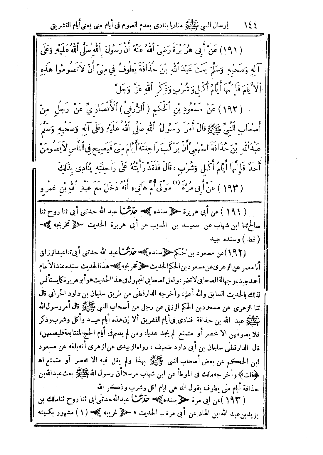 (192) عن مسعود بن الحكم (الزرقي) الأنصاري عن رجل من أصحاب النبي (صلى الله عليه وسلم) قال أمر رسول الله (صلى الله عليه وعلى آله وصحبه وسلم عبد الله بن حذاقة السهمي أن يركب راحلته أيام مني فيصبح في الناس لا يصومن أحد فإنها أيام أكل وشرب، قال فلقد رأيته على راحلته ينادي بذلك
