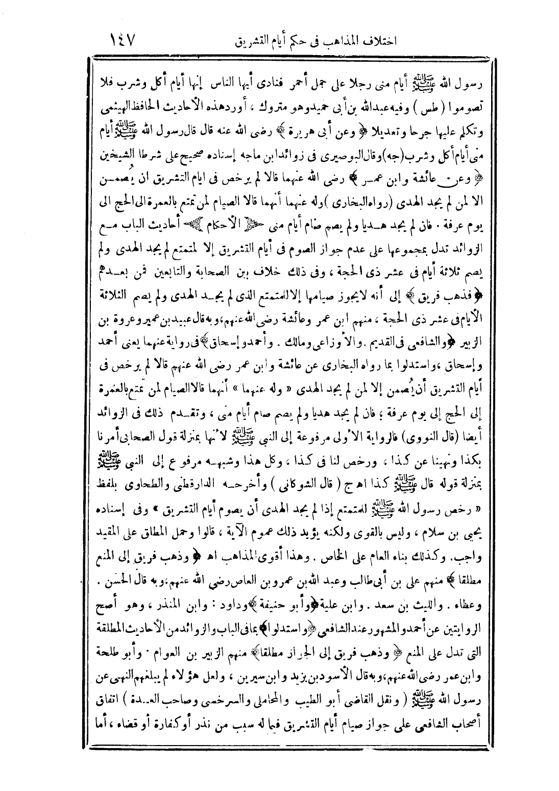 رسول الله (صلى الله عليه وسلم) أيام مني رجلاً على جمل أحمر فنادي أيها الناس إنها أيام أكل وشرب فلا تصوموا (طس) وفيه عبد الله بن أبى حميدو هو متروك، أورد هذه الأحاديث الحافظ الهيثمي وتلكم عليها جرحًا وتعديلاً (وعن أبى هريرة) رضي الله عنه قال قال رسول الله (صلى الله عليه وسلم) أيام مني أيام أكل وشرب (جه) وقال البوصيري في زوائد ابن ماجه إسناده صحيح على شرطا الشيخي (وعن عائشة وابن عمر) رضي الله عنهما قالا لم يرخص في أيام التشريق أن يصمن إلا لمن لم يجد الهدي (رواه البخاري) وله عنهما أنهما قالا الصيام لمن تمتع بالعمرة إلى الحج إلى يوم عرفه، فإن لم يجد هديًا ولم يصم صام أيام مني (الأحكام) أحاديث الباب مع الزوائد تدل بمجموعها على عدم جواز الصوم في أيام التشريق إلا لتمتع لم يجد الهدي ولم يصم ثلاثة أيام في عشر ذي الحجة، وفي ذلك خلاف بين الصحابة والتابعين فمن بعدهم (فذهب فريق) إلا أنه لا يجوز صيامها إلا للتمتع الذي لم يجد الهدي ولم يصم الثلاثة الأيام عشر ذي الحجة، منهم ابن عمر وعائشة رضي الله عنهم، وبه قال عبيد بن عمير وعروة بن الزبير (والشافعي في القديم والأوزاعي ومالك، وأحمد وإسحاق) في رواية عنهما يعني أحمد وإسحاق، واستدلوا بما رواه البخاري عن عائشة وابن عمر رضي الله عنه مقالا لم يرخص في أيام التشريق أين يصمن إلا لمن لم يجد الهدى "وله عنهما" أنهما قالا الصيام لمن تمتع بالعمرة إلى الحج إلى يوم عرفة؛ فإن لم يجد هديًا ولم يصم صام أيام مني، وتقدم ذلك في الزوائد أيضًا (قال النووي) فالرواية الأولى مرفوعة إلى النبي (صلى الله عليه وسلم) لأنها بمنزلة قول الصحابي أمرنا بكذا ونهينا عن كذا، ورخص لنا في كذا، وكل هذه وشبهه مرفوع إلى النبي (صلى الله عليه وسلم) بمنزله قوله قال (صلى الله عليه وسلم) كذا أهـ ج (قال الشوكاني) وأخرجه الدارقطني والطحاوي بلفظ "رخص رسول الله (صلى الله عليه وسلم) للتمتع إذا لم يجد الهدي أن يصوم أيام التشريق" وفي إسناده يحيي بن سلام، وليس بالقوي ولكنه يؤيد ذلك عموم الآية، قالوا وحمل المطلق على المقيد واجب، وكذلك بناء العام على الخاص، وهذا أقوى المذاهب أهـ (وذهب فريق إلى المنع مطلقًا) منهم على بن أبى طالب وعبد الله بن عمرو بن العاص رضي الله عنهم، وبه قال الحسن وعظاء، والليث بن سعد، وابن عليه (وأبو حنيفة) وداود: وابن المنذر، وهو أصح الروايتين عن أحمد والمشهور عند الشافعي (واستدلوا) بما في الباب الزوائد من الأحاديث المطلقة التي تدل على المنع (وذهب فريق إلى الجواز مطلقًا) منهم الزبير بن العوام، وأبو طلحة وابن عمر رضي الله عنهم، وبه قال الأسود بن يزيد وابن سيرين، ولعل هؤلاء لم يبلغهم النهي عن رسول الله (صلى الله عليه وسلم) (وتقل القاضي أبو الطيب والمحاملي والسرخسي وصاحب العمدة) إنفاق أصحاب الشافعي على جواز صيام أيام التشريق فيما له سبب من نذر أو كفارة أو قضاء، أما