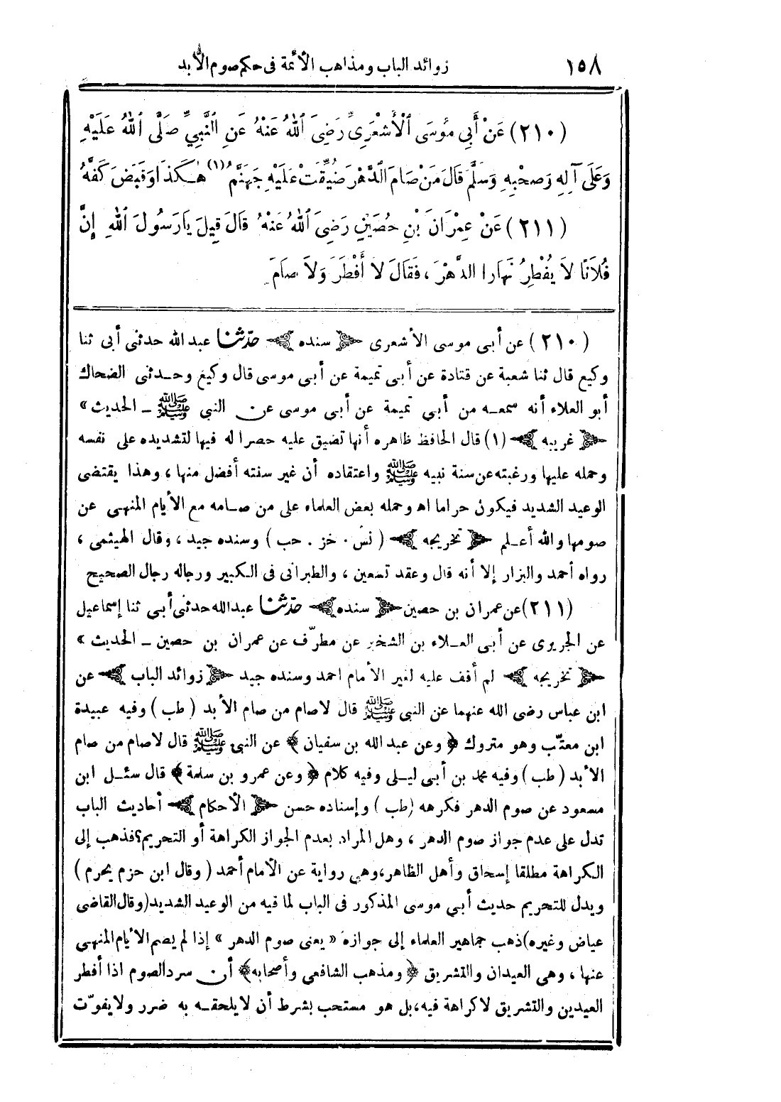 عن عمران بن حصين (سنده) حدّثنا عبد الله حدّثني أبي ثنا إسماعيل عن الجريري عن أبي العلاء بن الشخير عن مطرّف عن عمران بن حصين- الحديث" (تخريجه) لم أقف عليه لغير الأمام أحمد وسنده جيد (زوائد الباب) عن ابن عباس رضي الله عنهما عن النبي صلى الله عليه وسلم قال لا صام من صام الأبد (طب) وفيه عبيدة ابن معتّب وهو متروك (وعن عبد الله بن سفيان) عن النبي صلى الله عليه وسلم قال لا صام من صام الأبد (طب) وفيه محمد بن أبي ليلى وفيه كلام (وعن عمرو بن سلمة) قال سئل ابن مسعود عن صوم الدهر فكرهه (طب) وإسناده حسن (الأحكام) أحاديث الباب تدل على عدم جواز صوم الدهر، وهل المراد بعدم الجواز الكراهة أو التحريم؟ فذهب إلى الكراهة مطلقا إسحاق وأهل الظاهر، وهي رواية عن الأمام عن الأمام أحمد (وقال ابن حزم يحرم) ويدل للتحريم حديث أبي موسى المذكور في الباب لما فيه من الوعيد الشديد (وقال القاضي عياض وغيره) ذهب جماهير العلماء إلى جوازه "يعني صوم الدهر" إذا لم يصم الأيام المنهي عنها، وهي العيدان والتشريق (ومذهب الشافعي وأصحابه) أن سرد الصوم إذا أفطر العيدين والتشريق لا كراهة فيه، بل هو مستحب بشرط أن لا يلحقه به ضرر ولا يفوّت