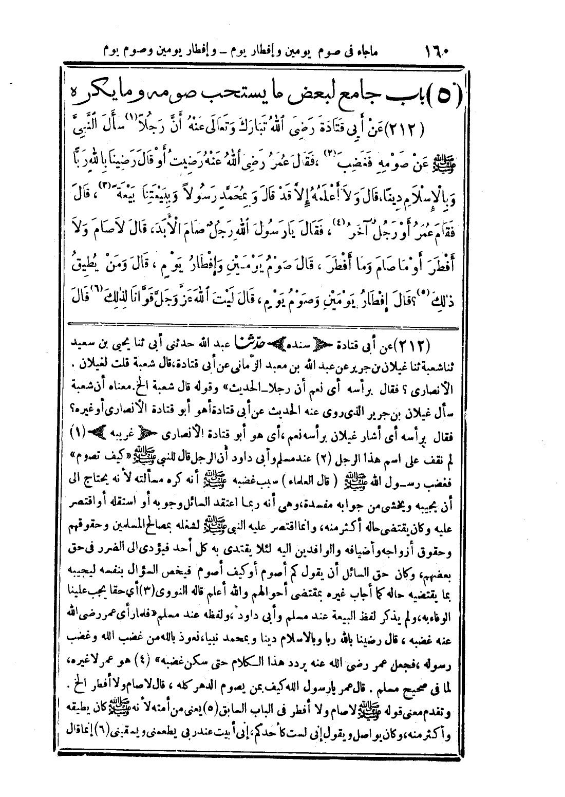 عن أبي قتادة رضي الله تبارك وتعالى عنه أنَّ رجلًا سأل النَّبي صلى الله عليه وسلم عن صومه فغضب، فقال عمر رضي الله عنه رضيت أو قال رضينا بالله ربَّا وبالإسلام دينًا، قال ولا أعلمه إلا قد قال وبمحمد رسولًا وبيعتنا بيعًة، قال فقام عمر أو رجل آخر، فقال يا رسول الله رجل صام الأبد، قال لا صام ولا أفطر أو ما صام وما أفطر، قال صوم يومين وإفطار يوم، قال ومن يطيق ذلك؟ قال إفطار يومين وصوم يوم، قال ليت الله عزَّ وجل قوَّانا لذلك قال