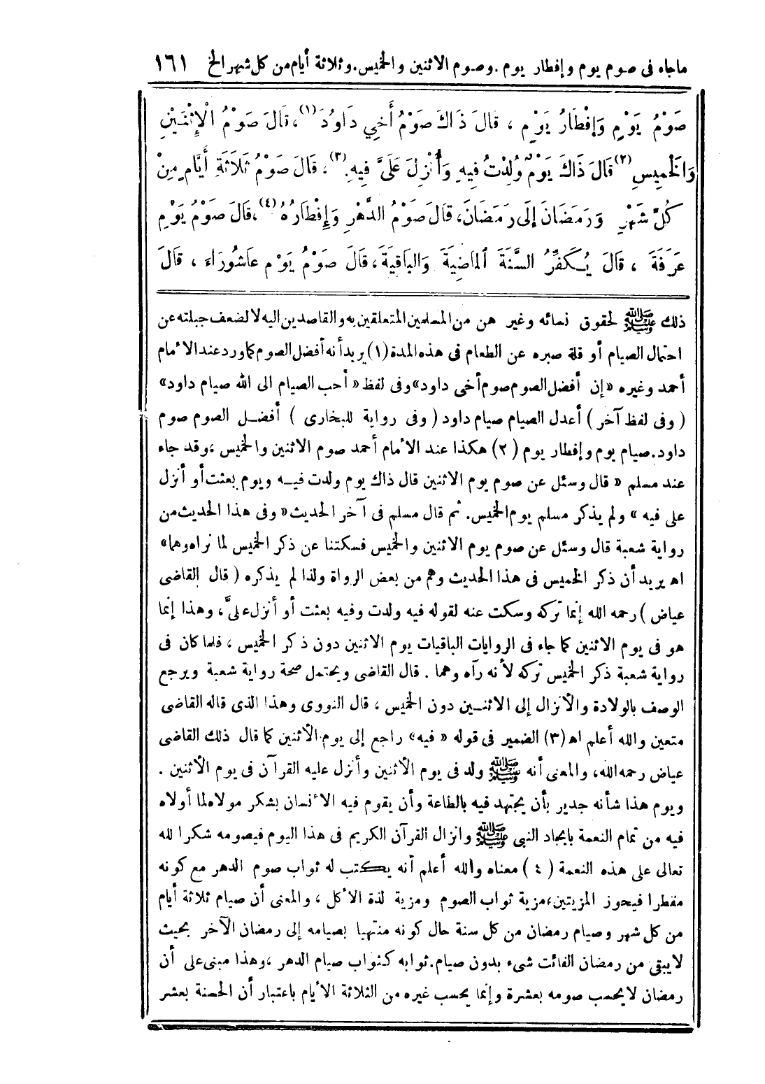 ذلك صلى الله عليه وسلم لحقوق نسائه وغيرهم من المسلمين المتعلقين به والقاصدين إليه لا لضعف جبلته عن احتمال الصيام أو قلة صبره عن الطعام في هذه المدة (1) يريد أنه أفضل الصوم كما ورد عند الأمام أحمد وغيره "إن أفضل الصوم صوم أخي داود" وفي لفظ "أحب الصيام إلى الله صيام داود" (وفي لفظ آخر) أعدل الصيام صيام داود (وفي رواية للبخاري) أفضل الصوم صوم داود. صيام يوم وإفطار يوم (2) هكذا عند الأمام أحمد صوم الاثنين والخميس، وقد جاء عند مسلم "قال وسئل عن صوم يوم الاثنين قال ذاك يوم ولدت فيه ويوم بعثت أو أنزل على فيه" ولم يذكر مسلم يوم الخميس. ثم قال مسلم في آخر الحديث "وفي هذا الحديث من رواية شعبة قال وسئل عن صوم يوم الاثنين والخمس فسكتنا عن ذكر الخميس لما نراه وهما" اهـ يريد أن ذكر الخميس في هذا الحديث وهم من بعض الرواة ولذا لم يذكره (قال القاضي عياض) رحمه الله إنما تركه وسكت عنه لقوله فيه ولدت وفيه بعثت أو أنزل علىَّ، وهذا إنما هو في يوم الاثنين كما جاء في الروايات الباقيات يوم الاثنين دون ذكر الخميس، فلما كان في رواية شعبة ذكر الخميس تركه لأنه رآه وهما. قال القاضي ويحتمل صحة رواية شعبة ويرجع الوصف بالولادة والأنزال إلى الاثنين دون الخميس، قال النووي وهذا الذي قاله القاضي متعين والله أعلم اه (3) الضمير في قوله "فيه" راجع إلى يوم الاثنين كما قال ذلك القاضي عياض رحمه الله، والمعنى أنه صلى الله عليه وسلم ولد في يوم الاثنين وأنزل عليه القرآن في يوم الاثنين. ويوم هذا شأنه جدير بأن يجتهد فيه بالطاعة وأن يقوم فيه الإنسان بشكر مولاه لما أولاه فيه من تمام النعمة بإيجاد النبي صلى الله عليه وسلم وإنزال القرآن الكريم في هذا اليوم فيصومه بشكرا لله تعالى على هذه النعمة (4) معناه والله أعلم أنه يكتب له ثواب صوم الدهر مع كونه مفطرا فيجوز المزيتين، مزية ثواب الصوم ومزية لذة الأكل، والمعنى أن صيام ثلاثة أيام من كل شهر وصيام رمضان من كل سنة حال كونه منتهيا بصيامه إلى رمضان الآخر بحيث لا يبقى من رمضان الفائت شيء بدون صيام. ثوابه كثواب صيام الدهر، وهذا مبنى على أن رمضان لا يحسب صومه بعشرة وإنما يحسب غيره من الثلاثة الأيام باعتبار أن الحسنة بعشر