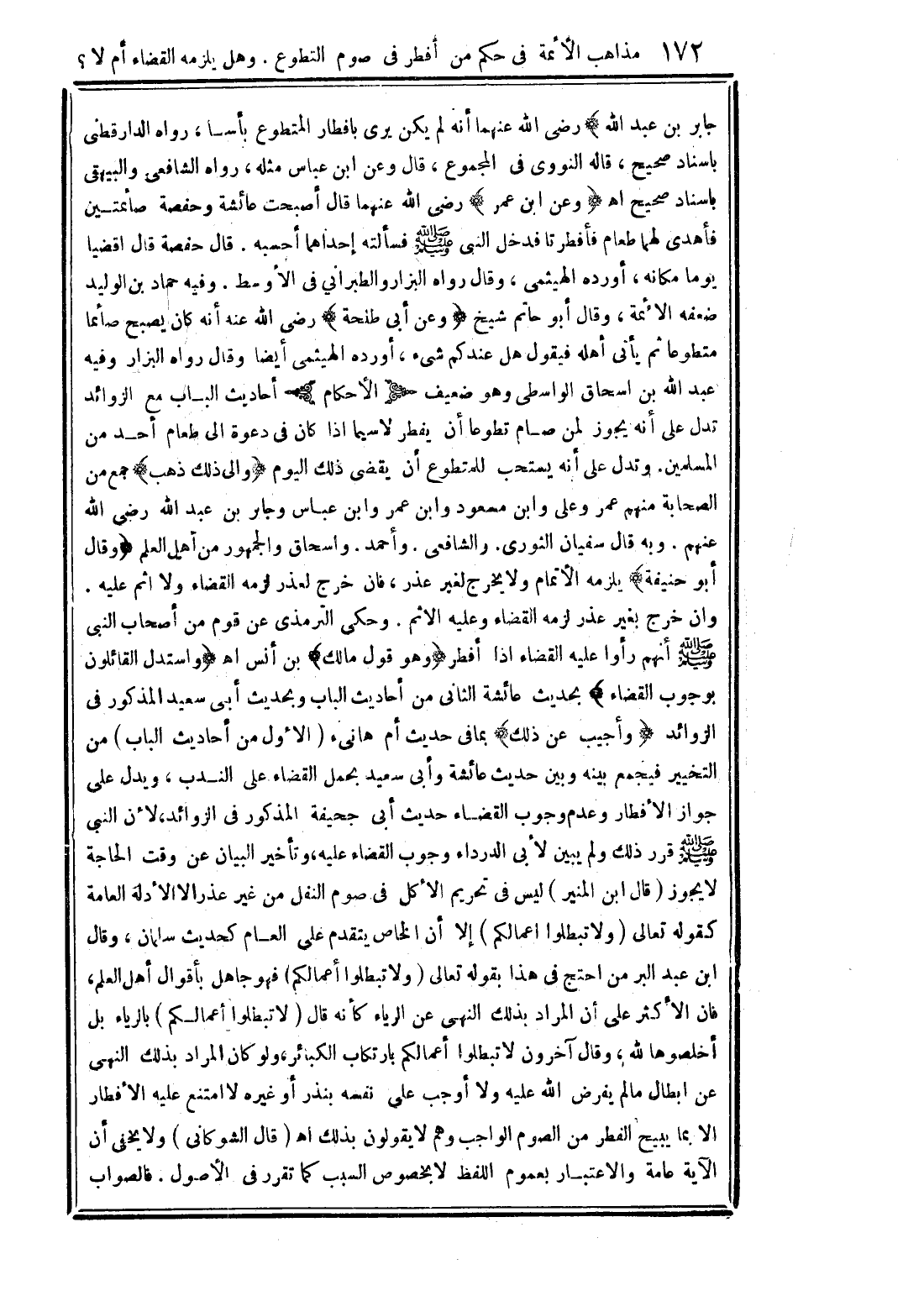 جابر بن عبد الله) رضي الله عنهما أنه لم يكن يرى بإفطار المتطوع بأسًا، رواه الدارقطني بإسناد صحيح، قاله النووي في المجموع، قال وعن ابن عباس مثله، رواه الشافعي والبيهقي بإسناد صحيح اهـ (وعن ابن عمر) رضي الله عنهما قال أصبحت عائشة وحفصة صائمتين فأهدى لهما طعام فأفطرتا فدخل النبي صلى الله عليه وسلم فسألته إحداهما أحسبه. قال حفصة قال اقضيا يومًا مكانه، أورده الهيثمي، وقال رواه البزار والطبراني في الأوسط. وفيه حماد بن الوليد ضعفه الأئمة، وقال أبو حاتم شيخ (وعن أبي طلحة) رضي الله عنه أنه كان يصبح صائمًا متطوعًا ثم يأتي أهله فيقول هل عندكم شيء، أورده الهيثمي أيضًا وقال رواه البزار وفيه عبد الله بن إسحاق الواسطي وهو ضعيف (الأحكام) أحاديث الباب مع الزوائد تدل على أنه يجوز لمن صام تطوعًا أن يفطر لاسيما إذا كان في الدعوة إلى طعام أحد من المسلمين. وتدل على أنه يستحب للمتطوع أن يقضى ذلك اليوم (وإلى ذلك ذهب) جمع من الصحابة منهم عمر وعلي وابن مسعود وابن عمر وابن عباس وجابر بن عبد الله رضي الله عنهم. وبه قال سفيان الثوري. والشافعي. وأحمد. وإسحاق والجمهور من أهل العلم (وقال أبو حنيفة) يلزمه الإتمام ولا يخرج لغير عذر، فإن خرج لعذر لزمه القضاء ولا إثم عليه. وإن خرج بغير عذر لزمه القضاء وعليه الإثم. وحكي الترمذي عن قوم من أصحاب النبي صلى الله عليه وسلم أنهم رأوا عليه القضاء إذا أفطر (وهو قول مالك) بن أنس اهـ (واستدل القائلون بوجوب القضاء) بحديث عائشة الثاني من أحاديث الباب وبحديث أبي سعيد المذكور في الزوائد (وأجيب عن ذلك) بما في حديث أم هانيء (الأول من أحاديث الباب) من التخيير فيجمع بينه وبين حديث عائشة وأبي سعيد بحمل القضاء على الندب، ويدل على جواز الإفطار وعدم وجوب القضاء حديث أبي جحيفة المذكور في الزوائد، لأن النبي صلى الله عليه وسلم قرر ذلك ولم يبين لأبي الدرداء وجوب القضاء عليه، وتأخير البيان عن وقت الحاجة لا يجوز (قال ابن المنير) ليس في تحريم الأكل في صوم النفل من غير عذرًا لا الأدلة العامة كقوله تعالى {ولا تبطلوا أعمالكم} إلا أن الخاص يتقدم على العام كحديث سلمان، وقال ابن عبد البر من احتج في هذا بقوله تعالى {ولا تبطلوا أعمالكم} فهو جاهل بأقوال أهل العلم، فإن الأكثر على أن المراد بذلك النهى عن الرياء كأنه قال (لا تبطلوا أعمالكم) بالرياء بل أخلصوها لله، وقال آخرون لا تبطلوا أعمالكم بارتكاب الكبائر، ولو كان المراد بذلك النهى عن إبطال ما لم يفرض الله عليه ولا أوجب على نفسه بنذر أو غيره لا امتنع عليه الإفطار إلا بما يبيح الفطر من الصوم الواجب وهم لا يقولون بذلك اهـ (قال الشوكاني) ولا يخفى أن الآية عامة والاعتبار بعموم اللفظ لا بخصوص السبب كما تقرر في الأصول. فالصواب