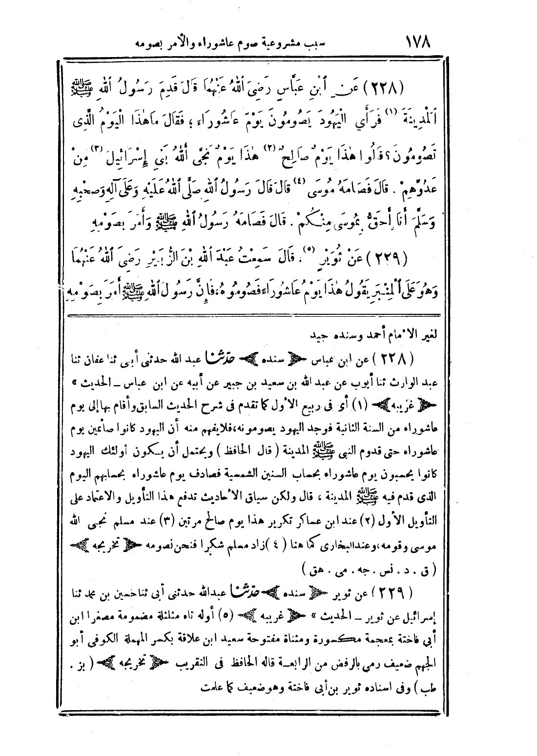 (228) عن ابن عباس رضي الله عنهما قال قدم رسول الله صلى الله عليه وسلم المدينة فرأى اليهود يصومون يوم عاشوراء؛ فقال ما هذا اليوم الذي تصومون؟ قالوا هذا يوم صالح هذا يوم نجي الله بني إسرائيل من عدوهم. قال فصامه موسى قال قال رسول الله صلى الله عليه وعلى آله وصحبه وسلم أنا أحق بموسي منكم. قال فصامه رسول الله صلى الله عليه وسلم وأمر بصومه.