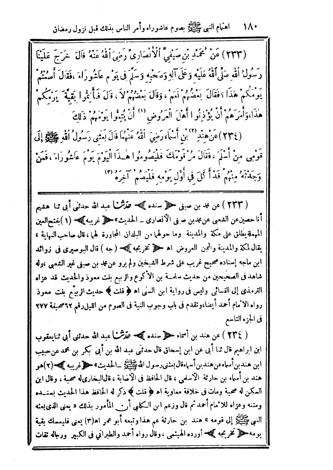 (233) عن محمد بن صيفي الأنصاري رضي الله عنه قال خرج علينا رسول الله صلى الله عليه وعلى آله وصحبه وسلم في يوم عاشوراء، فقال أصمتم يومكم هذا؟ فقال بعضهم نعم، وقال بعضهم لا، قال فأتموا بقية يومكم هذا، وأمرهم أن يؤذنوا أهل العروض أن يتموا يومهم ذلك