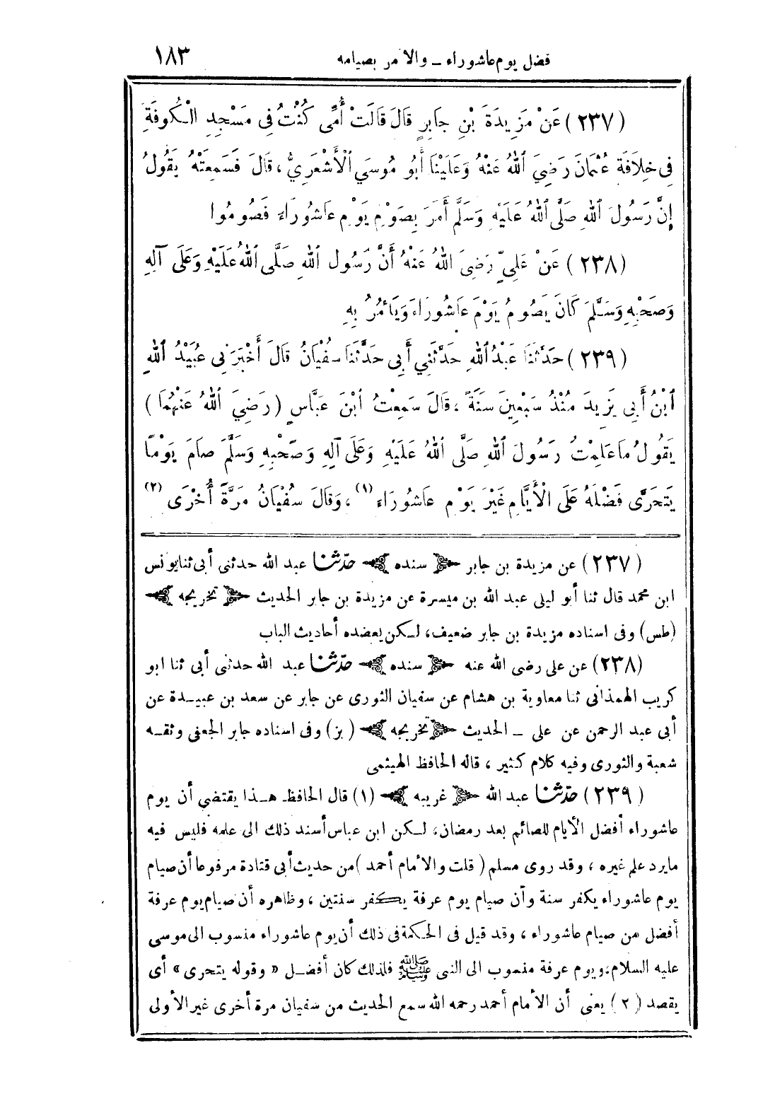 (238) عن علي رضي الله عنه أن رسول الله صلى الله عليه وعلى آله وصحبه وسلم كان يصوم يوم عاشوراء ويأمر به