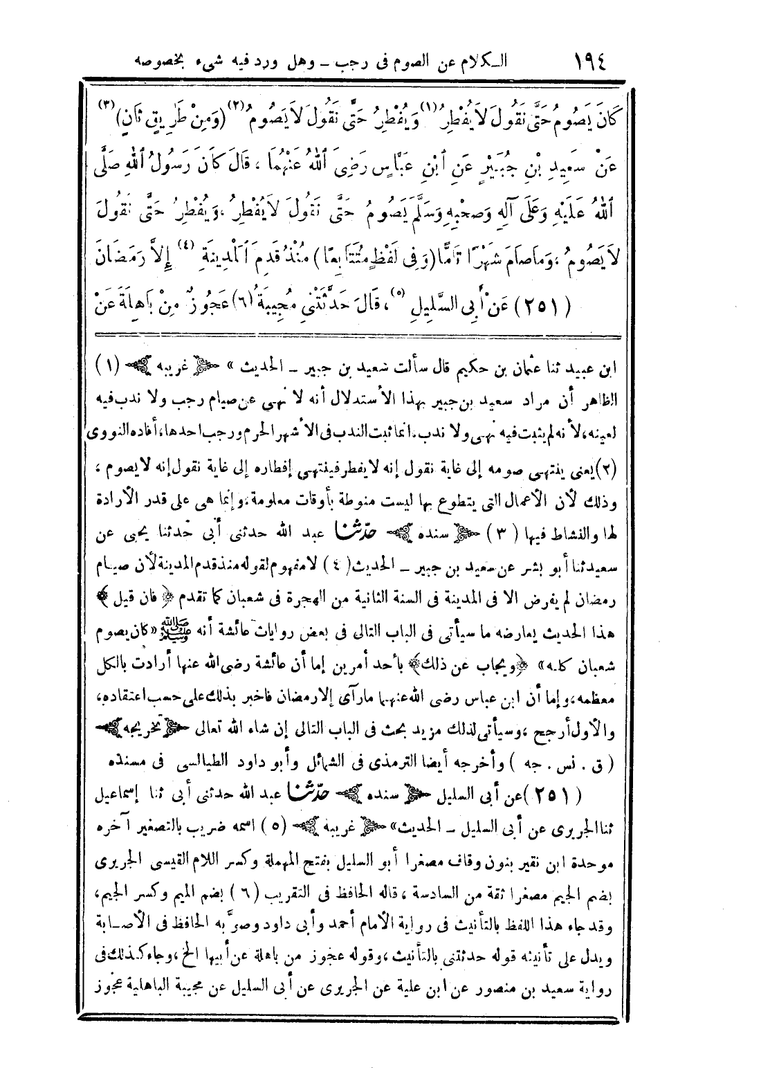 ابن عبيد ثنا عثمان بن حكيم قال سألت سعيد بن جبير- الحديث" (غريبه) (1) الظاهر أن مراد سعيد بن جبير بهذا الاستدلال أنه لا نهى عن صيام رجب ولا ندب فيه لعينه، لأنه لم يثبت فيه نهى ولا ندب. إنما ثبت الندب في الأشهر الحرم ورجب أحدها، أفاده النووي (2) يعنى ينتهي صومه إلى غاية نقول إنه لا يفطر فينتهي إفطاره إلى غاية نقول إنه لا يصوم، وذلك لأن الأعمال التي يتطوع بها ليست منوطة بأوقات معلومة، وإنما هي على قدر الإرادة لها والنشاط فيها (3) (سنده) حدثنا عبد الله حدثني أبي حدثنا يحيى عن سعيد ثنا أبو بشر عن سعيد بن جبير- الحديث (4) لا مفهوم لقوله منذ قدم المدينة لأن صيام رمضان لم يفرض إلا في المدينة في السنة الثانية من الهجرة في شعبان كما تقدم (فإن قيل) هذا الحديث يعارضه ما سيأتي في الباب التالي في بعض روايات عائشة أنه صلى الله عليه وسلم "كان يصوم شعبان كله" (ويجاب عن ذلك) بأحد أمرين إما أن عائشة رضي الله عنها أرادت بالكل معظمه، وإما أن ابن عباس رضي الله عنهما ما رآي إلا رمضان فاخبر بذلك على حسب اعتقاده، والأول أرجح، وسيأتي لذلك مزيد بحث في الباب التالي إن شاء الله تعالى (تخريجه) (ق. نس. جه) وأخرجه أيضًا الترمذي في الشمائل وأبو داود الطيالسي في مسنده