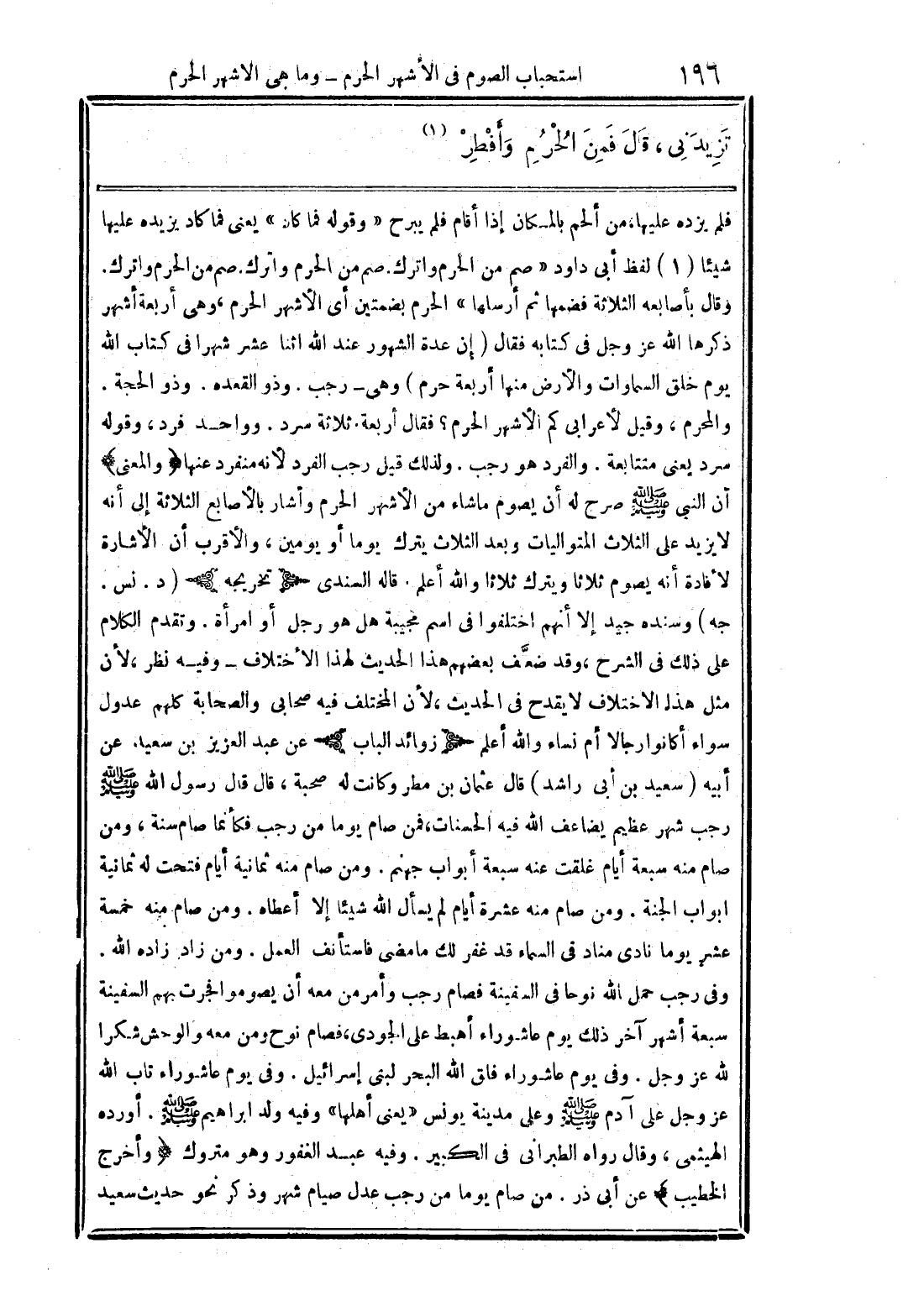 فلم يزده عليها، من ألحم بالمكان إذا أقام فلم يبرح "وقوله فما كاد" يعنى فما كاد يزيده عليها شيئًا (1) لفظ أبي داود "صم من الحرم واترك. صم من الحرم واترك. صم من الحرم واترك. وقال بأصابعه الثلاثة فضمها ثم أرسلها" الحرم بضمتين أي الأشهر الحرم، وهي أربعة أشهر ذكرها الله عز وجل في كتابه فقال {إن عدة الشهور عند الله اثنا عشر شهرًا في كتاب الله يوم خلق السماوات والأرض منها أربعة حرم} وهي- رجب. وذو القعدة. وذو الحجة. والمحرم، وقيل لأعرابي كم الأشهر الحرم؟ فقال أربعة. ثلاثة سرد. وواحد فرد، وقوله سرد يعنى متتابعة. والفرد هو رجب. ولذلك قيل رجب الفرد لأنه منفرد عنها (والمعنى) أن النبي صلى الله عليه وسلم صرح له أن يصوم ما شاء من الأشهر الحرم وأشار بالأصابع الثلاثة إلى أنه لا يزيد على الثلاث المتواليات وبعد الثلاث يترك يومًا أو يومين، والأقرب أن الإشارة لإفادة أنه يصوم ثلاثًا ويترك ثلاثًا والله أعلم. قاله السندي (تخريجه) (د. نس. جه) وسنده جيد إلا أنهم اختلفوا في اسم مجيبة هل هو رجل أو امرأة. وتقدم الكلام على ذلك في الشرح، وقد ضعف بعضهم هذا الحديث لهذا الاختلاف- وفيه نظر، لأن مثل هذا الاختلاف لا يقدح في الحديث، لأن المختلف فيه صحابي والصحابة كلهم عدول سواء أكانوا رجالاً أم نساء والله أعلم (زوائد الباب) عن عبد العزيز بن سعيد عن أبيه (سعيد بن أبي راشد) قال عثمان بن مطر وكانت له صحبة، قال قال رسول الله صلى الله عليه وسلم رجب شهر عظيم يضاعف الله فيه الحسنات، فمن صام يومًا من رجب فكأنما صام سنة، ومن صام منه سبعة أيام غلقت عنه سبعة أبواب جهنم. ومن صام منه ثمانية أيام فتحت له ثمانية أبواب الجنة. ومن صام منه عشرة أيام لم يسأل الله شيئًا إلا أعطاه. ومن صام منه خمسة عشر يوما نادى مناد في السماء قد غفر لك ما مضى فاستأنف العمل. ومن زاد زاده الله. وفي رجب حمل الله نوحًا في السفينة فصام رجب وأمر من معه أن يصوموا فجرت بهم السفينة سبعة أشهر آخر ذلك يوم عاشوراء أهبط على الجودي، فصام نوح ومن معه والوحش شكرًا لله عز وجل. وفي يوم عاشوراء فلق الله البحر لبنى إسرائيل. وفي يوم عاشوراء تاب الله عز وجل على آدم صلى الله عليه وسلم وعلى مدينة يونس "يعنى أهلها" وفيه ولد إبراهيم عليه السلام. أورده الهيثمي، وقال رواه الطبراني في الكبير. وفيه عبد الغفور وهو متروك (وأخرج الخطيب) عن أبي ذر. من صام يومًا من رجب عدل صيام شهر وذكر نحو حديث سعيد