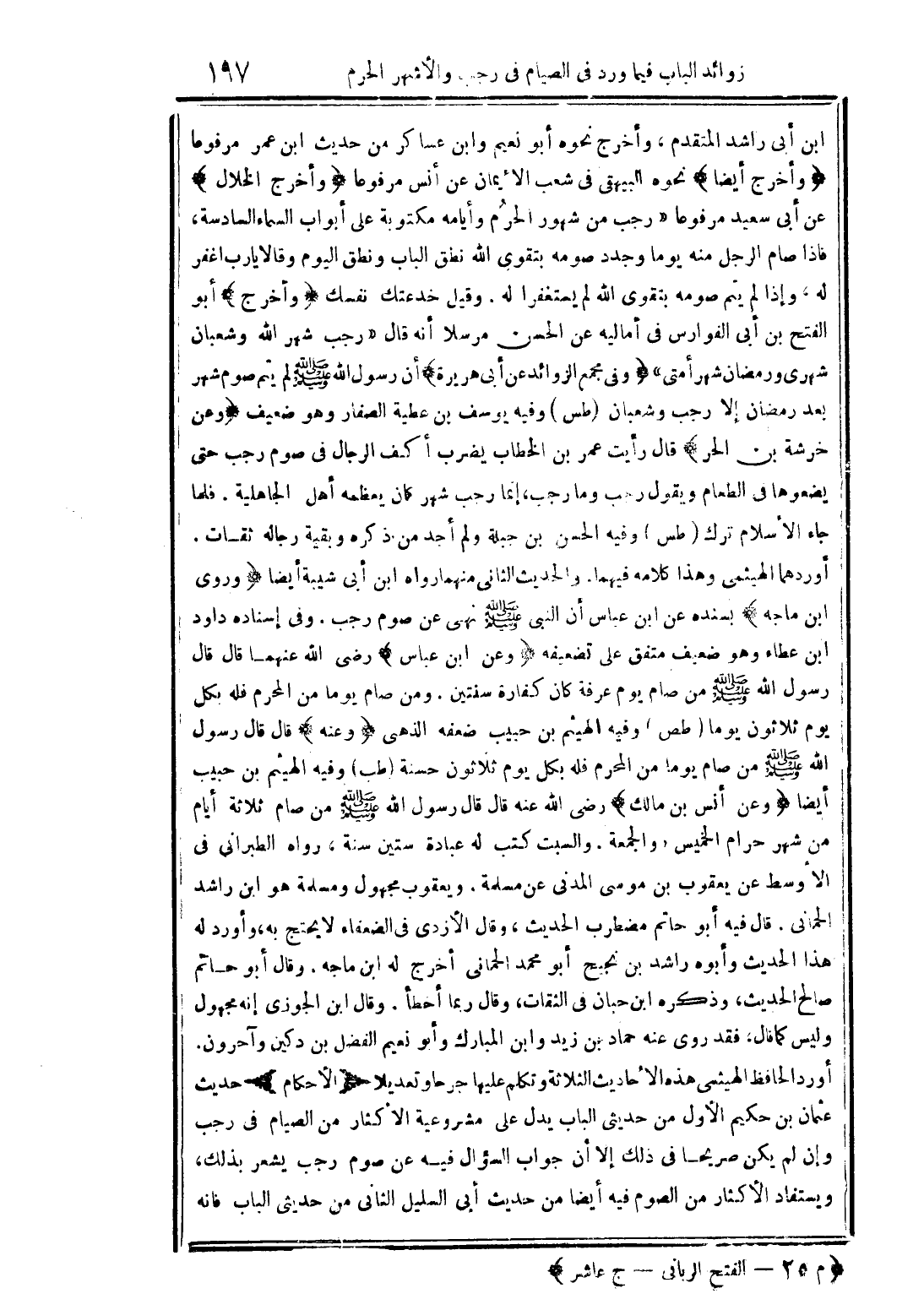 ابن أبي راشد المتقدم، وأخرج نحوه أبو نعيم وابن عساكر من حديث ابن عمر مرفوعًا (وأخرج أيضًا) نحوه البيهقي في شعب الإيمان عن أنس مرفوعًا (وأخرج الخلال) عن أبي سعيد مرفوعًا "رجب من شهور الحرم وأيامه مكتوبة على أبواب السماء السادسة، فإذا صام الرجل منه يومًا وجدد صومه بتقوى الله نطق الباب ونطق اليوم وقالا يارب اغفر له، وإذا لم يتم صومه بتقوى الله لم يستغفرا له. وقيل خدعتك نفسك (واخرج) أبو الفتح بن أبي الفوارس في أماليه عن الحسن مرسلاً أنه قال "رجب شهر الله وشعبان شهري ورمضان شهر أمتي" (وفي مجمع الزوائد عن أبي هريرة) أن رسول الله صلى الله عليه وسلم لم يتم صوم شهر بعد رمضان إلا رجب وشعبان (طس) وفيه يوسف بن عطية الصفار وهو ضعيف (وعن خرشة بن الحر) قال رأيت عمر بن الخطاب يضرب أكف الرجال في صوم رجب حتى يضعوها في الطعام ويقول رجب وما رجب، إنما رجب شهر كان يعظمه أهل الجاهلية. فلما جاء الإسلام ترك (طس) وفيه الحسن بن جبلة ولم أجد من ذكره وبقية رجاله ثقات. أوردهما الهيثمي وهذا كلامه فيهما. والحديث الثاني منهما رواه ابن أبي شيبة أيضًا (وروى ابن ماجه) بسنده عن ابن عباس أن النبي صلى الله عليه وسلم نهى عن صوم رجب. وفي إسناده داود ابن عطاء وهو ضعيف متفق على تضعيفه (وعن ابن عباس) رضي الله عنهما قال قال رسول الله صلى الله عليه وسلم من صام يوم عرفة كان كفارة سنتين. ومن صام يومًا من المحرم فله بكل يوم ثلاثون يومًا (طص) وفيه الهيثم بن حبيب ضعفه الذهبي (وعنه) قال قال رسول الله صلى الله عليه وسلم من صام يومًا من المحرم فله بكل يوم ثلاثون حسنة (طب) وفيه الهيثم بن حبيب أيضًا (وعن أنس بن مالك) رضي الله عنه قال قال رسول الله صلى الله عليه وسلم من صام ثلاثة أيام من شهر حرام الخميس، والجمعة. والسبت كتب له عبادة ستين سنة، رواه الطبراني في الأوسط عن يعقوب بن موسي المدني عن مسلمة. ويعقوب مجهول ومسلمة هو ابن راشد الحماني. قال فيه أبو حاتم مضطرب الحديث، وقال الأزدي في الضعفاء لا يحتج به، وأورد له هذا الحديث وأبوه راشد بن نجيح أبو محمد الحماني أخرج له ابن ماجه. وقال أبو حاتم صالح الحديث، وذكره ابن حبان في الثقات، وقال ربما أخطأ. وقال ابن الجوزي إنه مجهول وليس كما قال: فقد روى عنه حماد بن زيد وابن المبارك وأبو نعيم الفضل بن دكين وآخرون. أورد الحافظ الهيثمي هذه الأحاديث الثلاثة وتكلم عليها جرحًا وتعديلاً (الأحكام) حديث عثمان بن حكيم الأول من حديثي الباب يدل على مشروعية الإكثار من الصيام في رجب وإن لم يكن صريحًا في ذلك إلا أن جواب السؤال فيه عن صوم رجب يشعر بذلك، ويستفاد الإكثار من الصوم فيه أيضًا من حديث أبي السليل الثاني من حديثي الباب فإنه