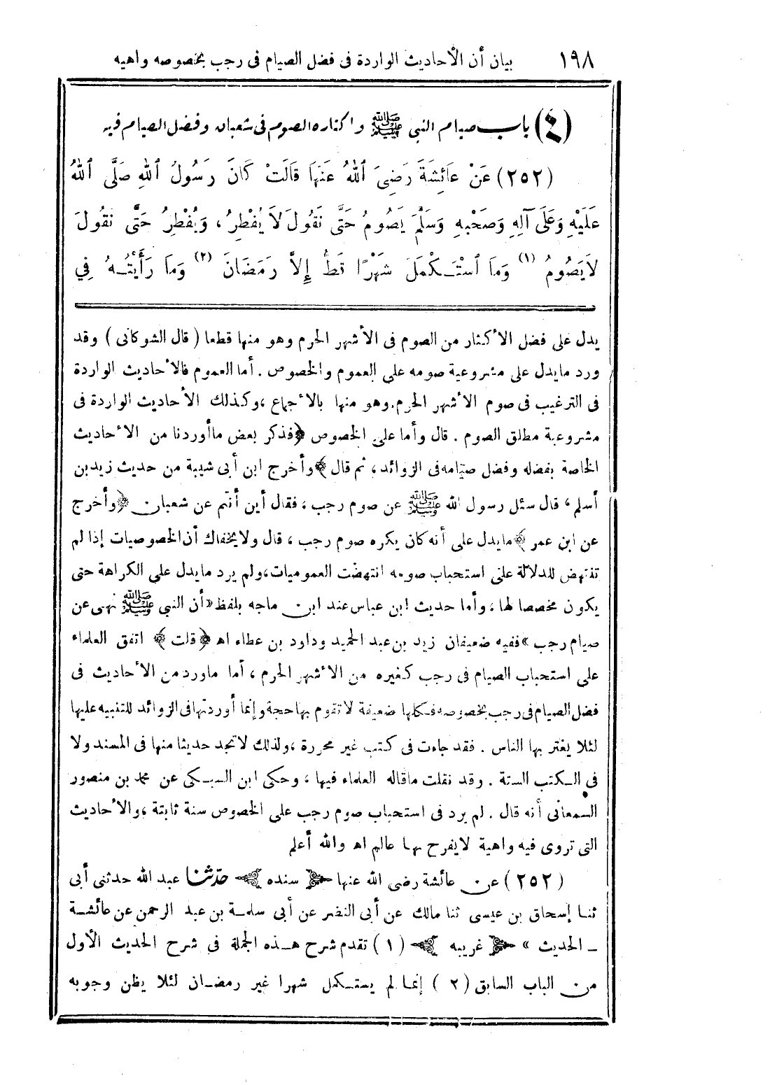 (252) عن عائشة رضي الله عنها قالت كان رسول الله صلى الله عليه وعلى آله وصحبه وسلم يصوم حتى نقول لا يفطر، ويفطر حتى نقول لا يصوم وما استكمل شهرًا قط إلا رمضان وما رأيته في