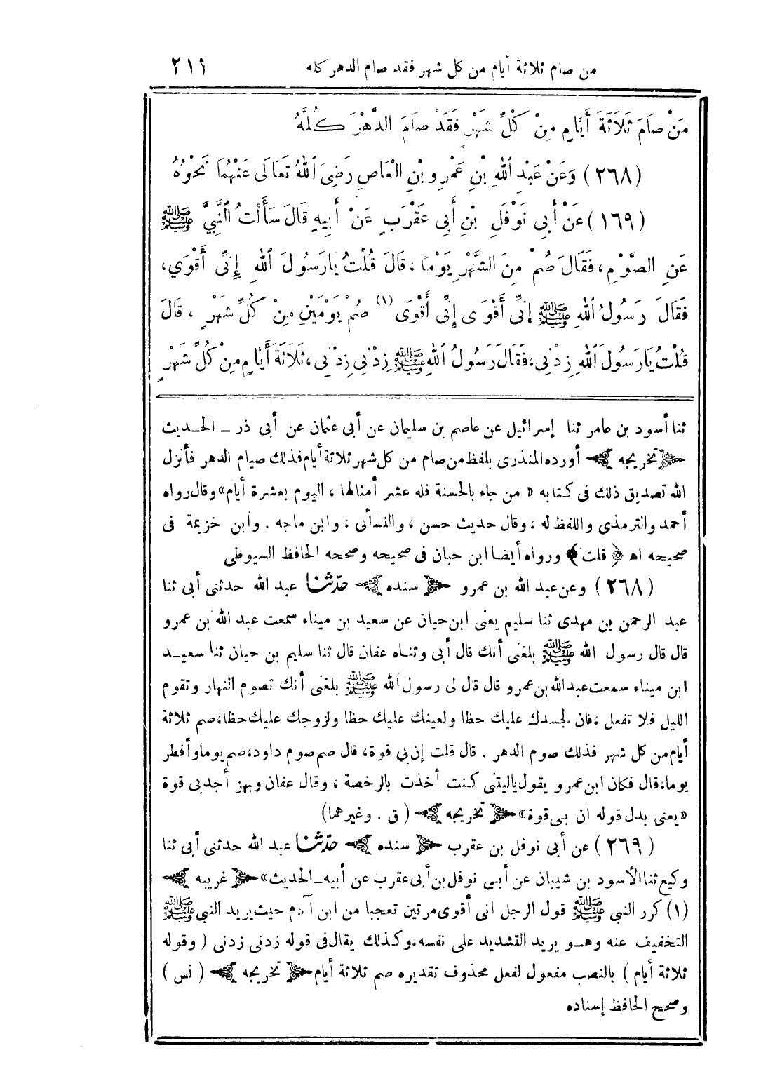 (268) وعن عبد الله بن عمرو (سنده) حدثنا عبد الله حدثني أبي ثنا عبد الرحمن بن مهدي ثنا سليم يعني ابن حيان عن سعيد بن ميناء سمعت عبد الله بن عمرو قال: قال رسول الله صلى الله عليه وسلم بلغني أنك قال أبي وثناه عفان قال ثنا سليم بن حيان ثنا سعيد ابن ميناء سمعت عبد الله بن عمرو قال قا لي رسول الله صلى الله عليه وسلم بلغني أنك تصوم النهار وتقوم الليل فلا تفعل، فإن لجسدك عليك حظاً ولعينك عليك حظاً ولزوجك عليك حظاً، صم ثلاثة أيام من كل شهر فذلك صوم الدهر. قال قلت إن بي قوة، قال صم صوم داود، صم يوماً وأفطر يوماً، قال فكان ابن عمرو يقول يا ليتني كنت أخذت بالرخصة، وقال عفان ويهز أجد بي قوة "يعني بدل قوله أن بني قوة" (تخريجه) (ق. وغيرها)