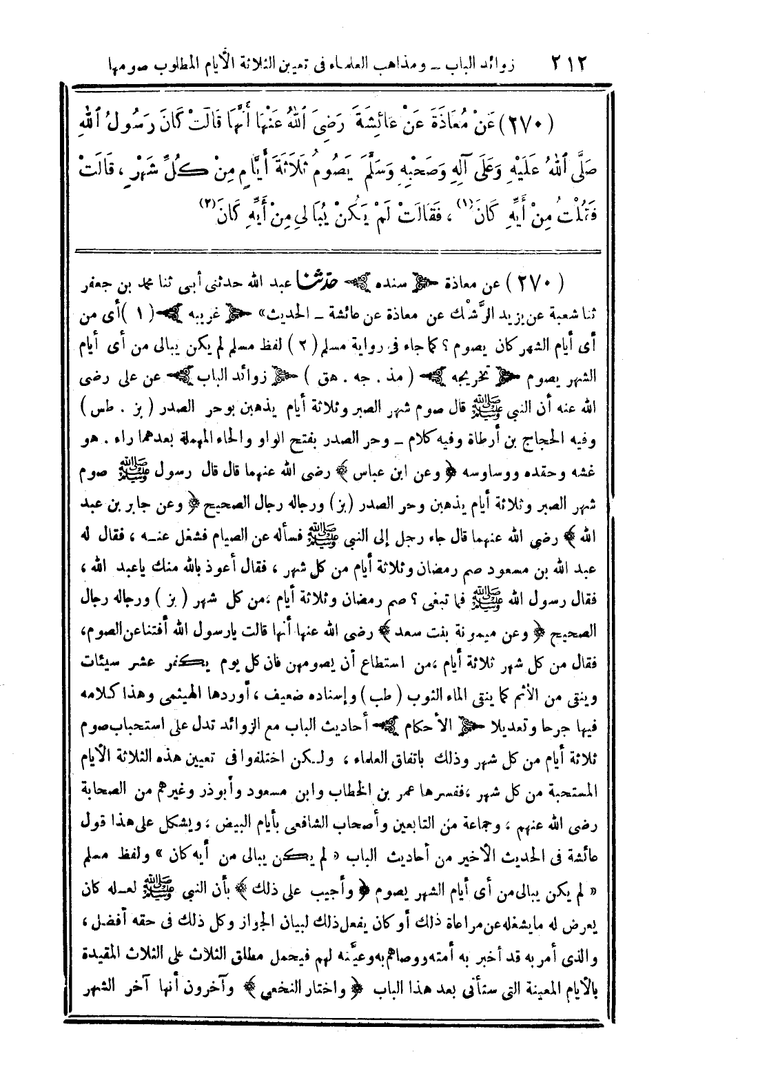 (270) عن معاذة (سنده) حدثنا عبد الله حدثني أبي ثنا محمد بن جعفر تنا شعبة عن يزيد الرشك عن معاذة عن عائشة- الحديث" (غريبه) (1) أي من أي أيام الشهر كان يصوم؟ كما جاء في رواية مسلم (2) لفظ مسلم لم يكن يبالي من أي أيام الشهر يصوم (تخريجه) (مذ. جه. هق) (زوائد الباب) عن علي رضي الله عنه أن النبي صلى الله عليه وسلم قال صوم الصبر وثلاثة أيام يذهبن بوحر الصدر (بز. طس) وفيه الحجاج بن أرطاة وفيه كلام- وحر الصدر بفتح الواو والحاء المهملة بعدها راء. هو غشة وحقده ووساوسه (وعن ابن عباس) رضي الله عنهما قال قال سول صلى الله عليه وسلم صوم شهر الصبر وثلاثة أيام يذهبن وحر الصدر (بز) ورجاله رجال الصحيح (وعن جابر بن عبد الله) رضي الله عنهما قال جاء رجل إلى النبي صلى الله عليه وسلم فسأله عن الصيام فشغل عنه، فقال له عبد اله بن مسعود صم رمضان وثلاثة أيام من كل شهر، فقال أعوذ بك منك يا عبد الله، فقال رسول الله صلى الله عليه وسلم فما تبغي؟ صم رمضان وثلاثة أيام، من كل شهر (بز) ورجاله رجال الصحيح (وعن ميمونة بنت سعد) رضي الله عنها أنها قالت يا رسول الله أفتنا عن الصوم، فقال من كل شهر ثلاثة أيام، من استطاع أن يصومهن فان كل يوم يكفر عشر سيئات وينقى من الأثم كما ينقى الماء الثوب (طب) وإسناده ضعيف، أوردها الهيثمي وهذا كلامه فيها جرحا وتعديلاً (الأحكام) أحاديث الباب مع الزوائد تدل على استحباب صوم ثلاثة أيام من كل شهر وذلك باتفاق العلماء، ولكن ولكن اختلفوا في تعيين هذه الثلاثة الأيام المستحبة من كل شهر، ففسرها عمر بن الخطاب وابن مسعود وأبو مسعود وأبو وغيرهم من الصحابة رضي الله عنهم، وجماعة من التابعين وأصحاب الشافعي بأيام البيض، ويشكل على هذا قول عائشة في الحديث الأخير من أحاديث الباب "لم يكن ببالي من أية كان" ولفظ مسلم "لم يكن ببالي من أي أيام الشهر يصوم (وأجيب على ذلك) بأن النبي صلى الله عليه وسلم لعله كان يعرض له ما يشغله عن مراعاة ذلك أو كان يفعل ذلك لبيان الجواز وكل ذلك في حقه أفضل، والذي أمر به قد أخبر به أمته ووصاهم به وعينه لهم فيحمل مطلق الثلاث على الثلاث المقيدة بالأيام المعينة التي ستأتي بعدها هذا الباب (واختار النخعي) وآخرون أنها آخر الشهر